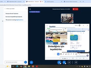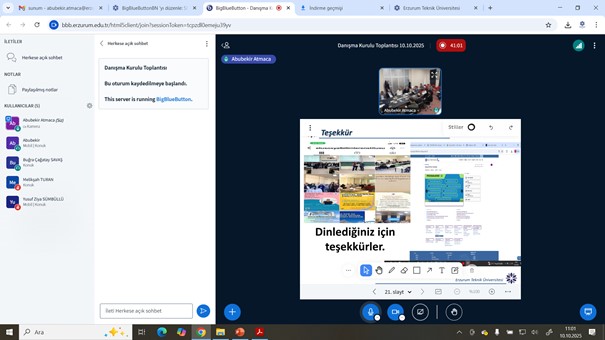 2024-2025 Eğitim-Öğretim Yılı bahar yarıyılı değerlendirme ve 2025-2026 Eğitim-Öğretim Yılı hazırlık çalışmaları kapsamında 10.10.2025 tarihinde Sosyal Bilimler Enstitü Müdürü Prof. Dr. Serap BEDİR KARA başkanlığında Danışma Kurulu üyeleri ile online ve yüz yüze katılımlı “2025-2026 Öğretim Yılı I. Danışma Kurulu Toplantısı” gerçekleştirilmiştir.