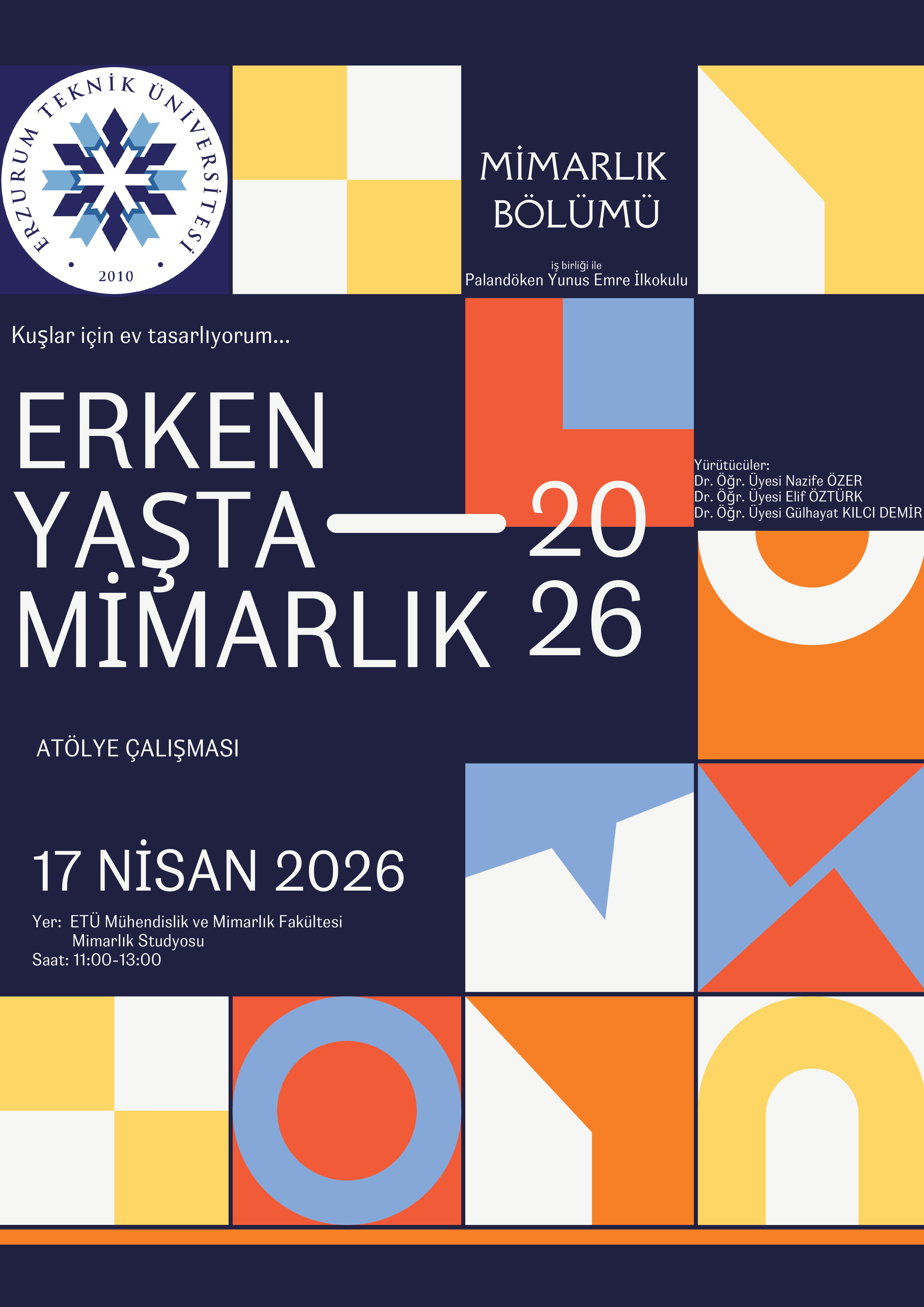 Üniversitemiz Mimarlık Bölümü tarafından, toplumsal katkı kapsamında ilkokul öğrencilerine yönelik "Erken Yaşta Mimarlık: Kuşlar İçin Ev Tasarlıyorum" isimli uygulamalı mimarlık atölyesi düzenlenecektir.