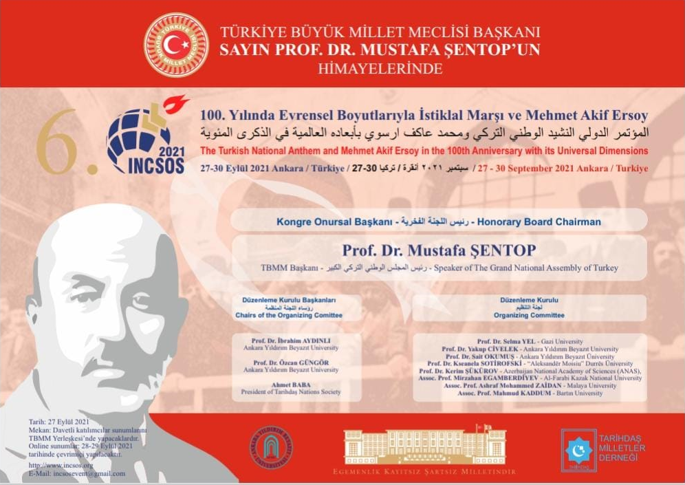 Bilindiği üzere 2021 yılı, TBMM tarafından "İstiklal Marşı ve Mehmet Akif Ersoy Yılı" olarak ilan edilmiş olup Üniversitemiz Senatosunun ilgi kararı ile üniversitemizde de "İstiklal Marşı Yılı" olarak kabul edilmiştir. Bu bağlamda TBMM Başkanı Sn. Prof. Dr. Mustafa ŞENTOP'un himayelerinde Rektörlüğümüz ile Tarihdaş Milletler Derneği ana işbirliğinde ve bir çok kurumun desteğiyle 27-30 Eylül 2021 tarihleri arasında 6. INCSOS "100. Yılında Evrensel Boyutlarıyla İstiklal Marşı ve Mehmet Akif Ersoy Kongresi" gerçekleştirilecektir.