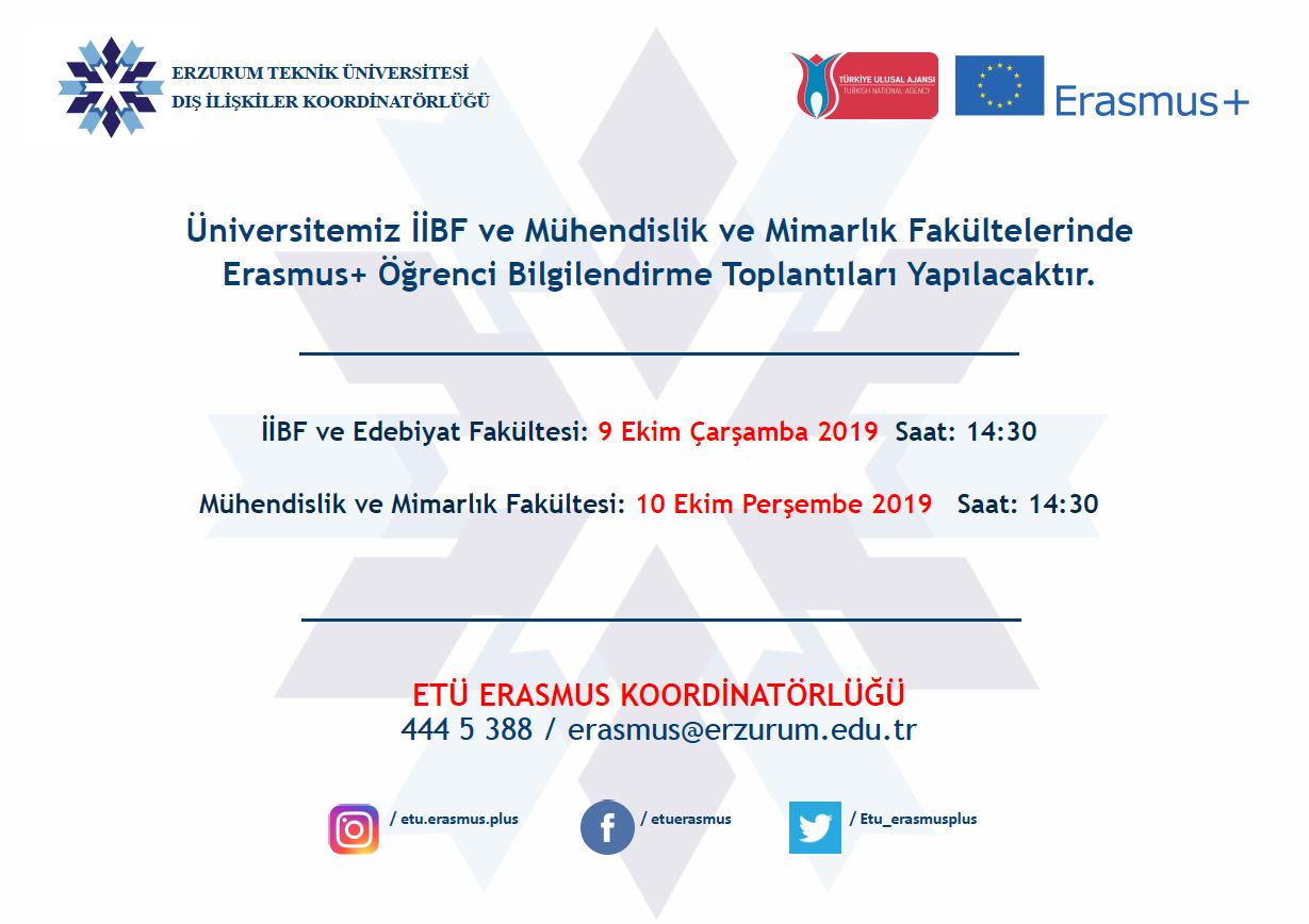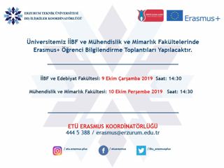Üniversitemiz İİBF ve Mühendislik ve Mimarlık Fakültelerinde Erasmus+ Öğrenci Bilgilendirme toplantıları yapılacaktır. Toplantıların yer ve zaman detayları aşağıdaki gibidir: