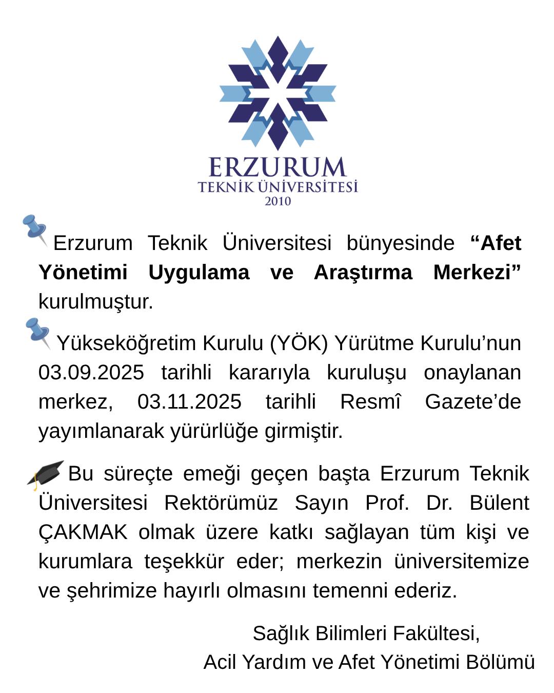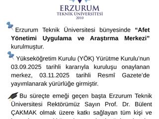 Erzurum Teknik Üniversitesi bünyesinde “Afet Yönetimi Uygulama ve Araştırma Merkezi” kurulmuştur.