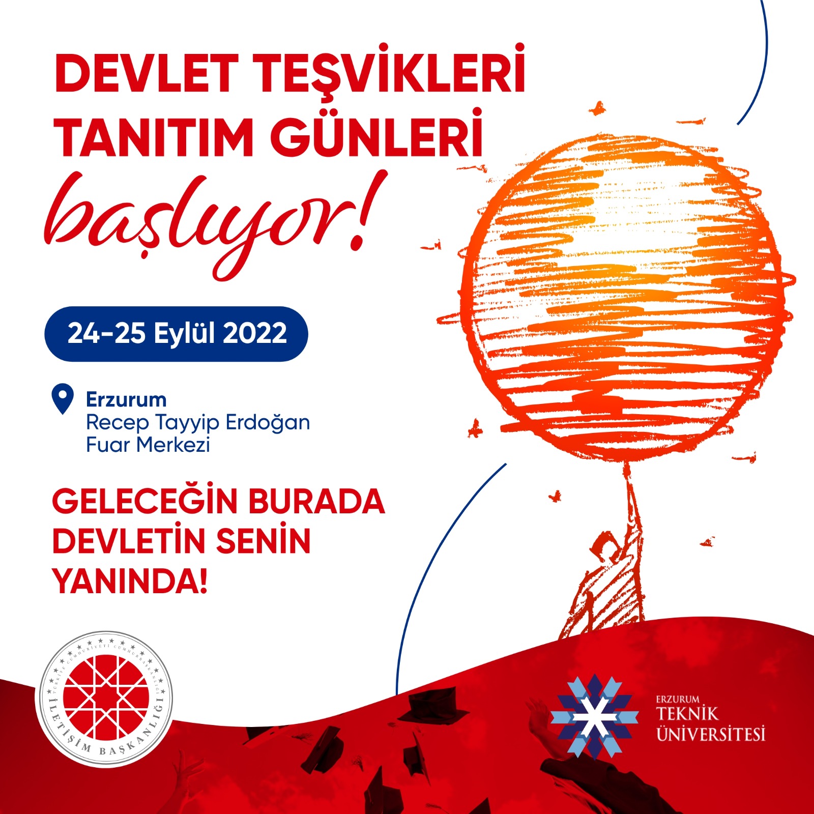 “Geleceğin Burada, Devletin Senin Yanında” sloganıyla 24-25 Eylül 2022 Cumartesi ve Pazar günleri 10:00-18:00 saatleri arasında Cumhurbaşkanlığı İletişim Başkanlığı “Devlet Teşvikleri Tanıtım Günleri” etkinliği Recep Tayyip Erdoğan Fuar Merkezinde yapılacaktır.
