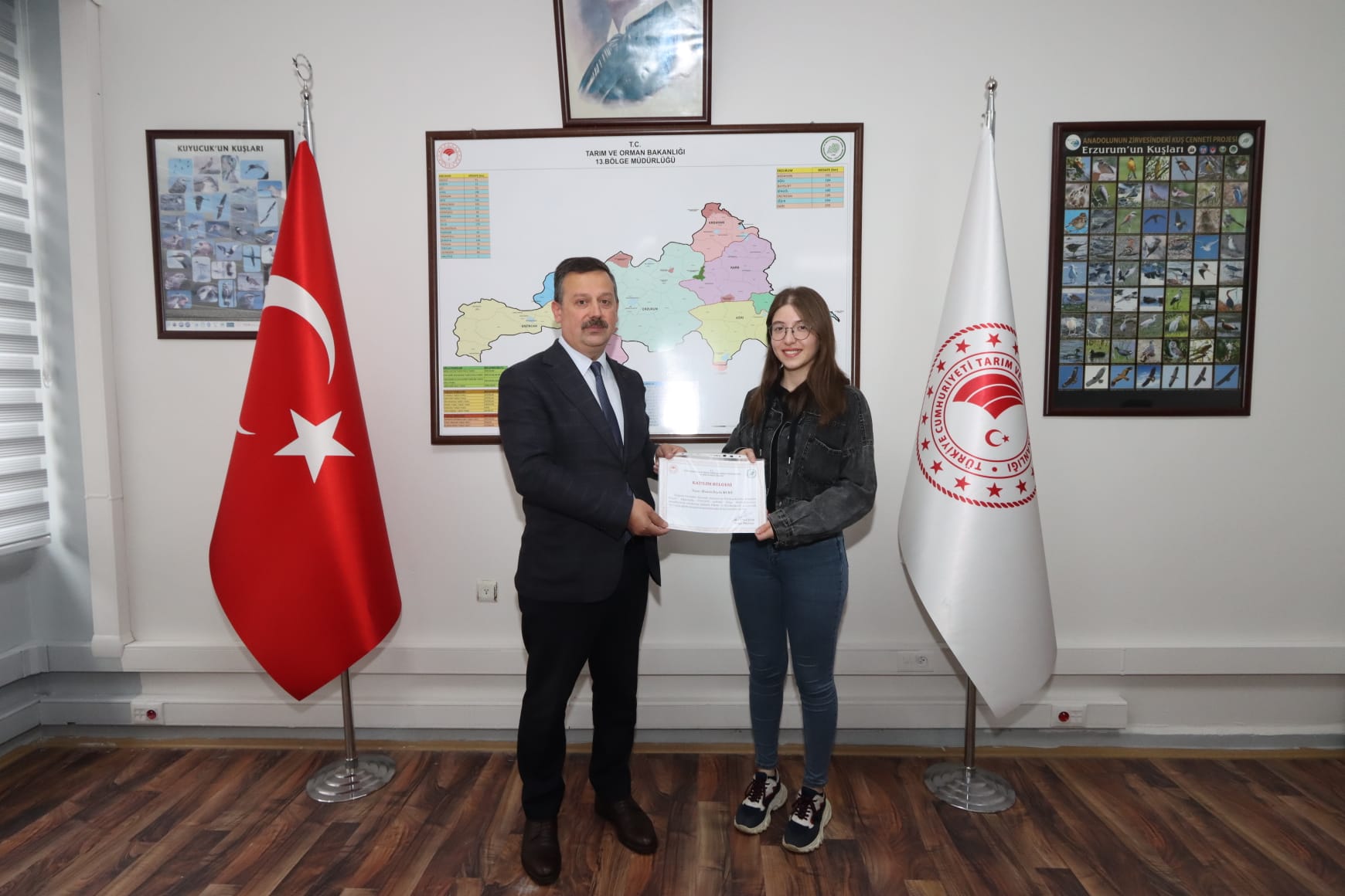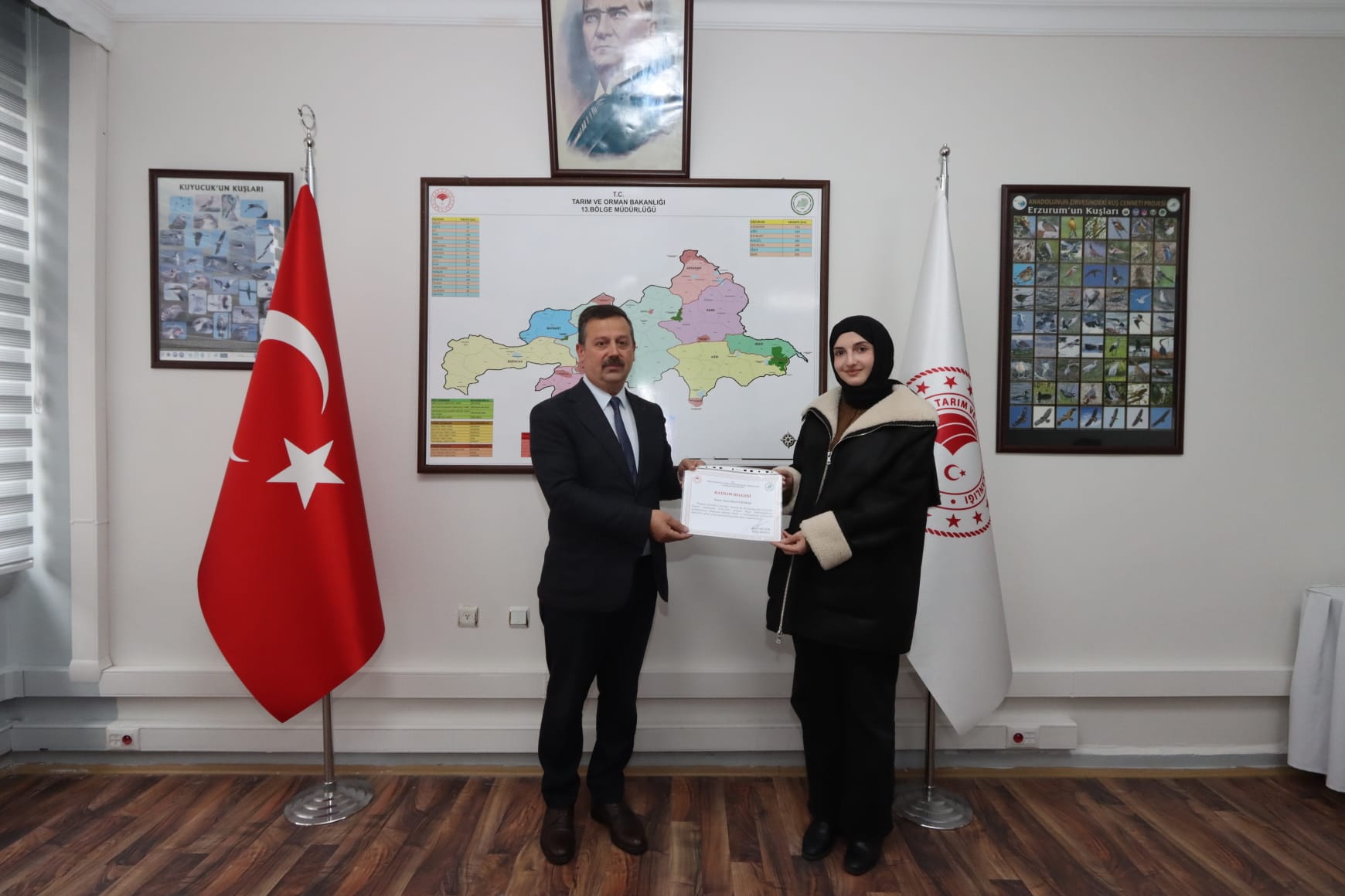 "Doğanın Hazineleri Güvende: Erzurum'da Biyokaçakçılıkla Mücadele" ÜNİDES Projesi kapsamında Doğa Koruma ve Milli Parklar Bölge Müdürü tarafından, Fakültemiz öğretim üyelerine ve öğrencilerine "Eğiticilerin Eğitimi" belgeleri takdim edildi. Proje kapsamında bölgede biyaçeşitlilik ve biyokaçakçılık konularında farkındalığın arttırılması hedefleniyor.