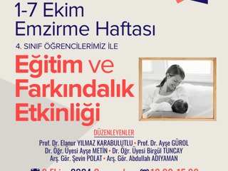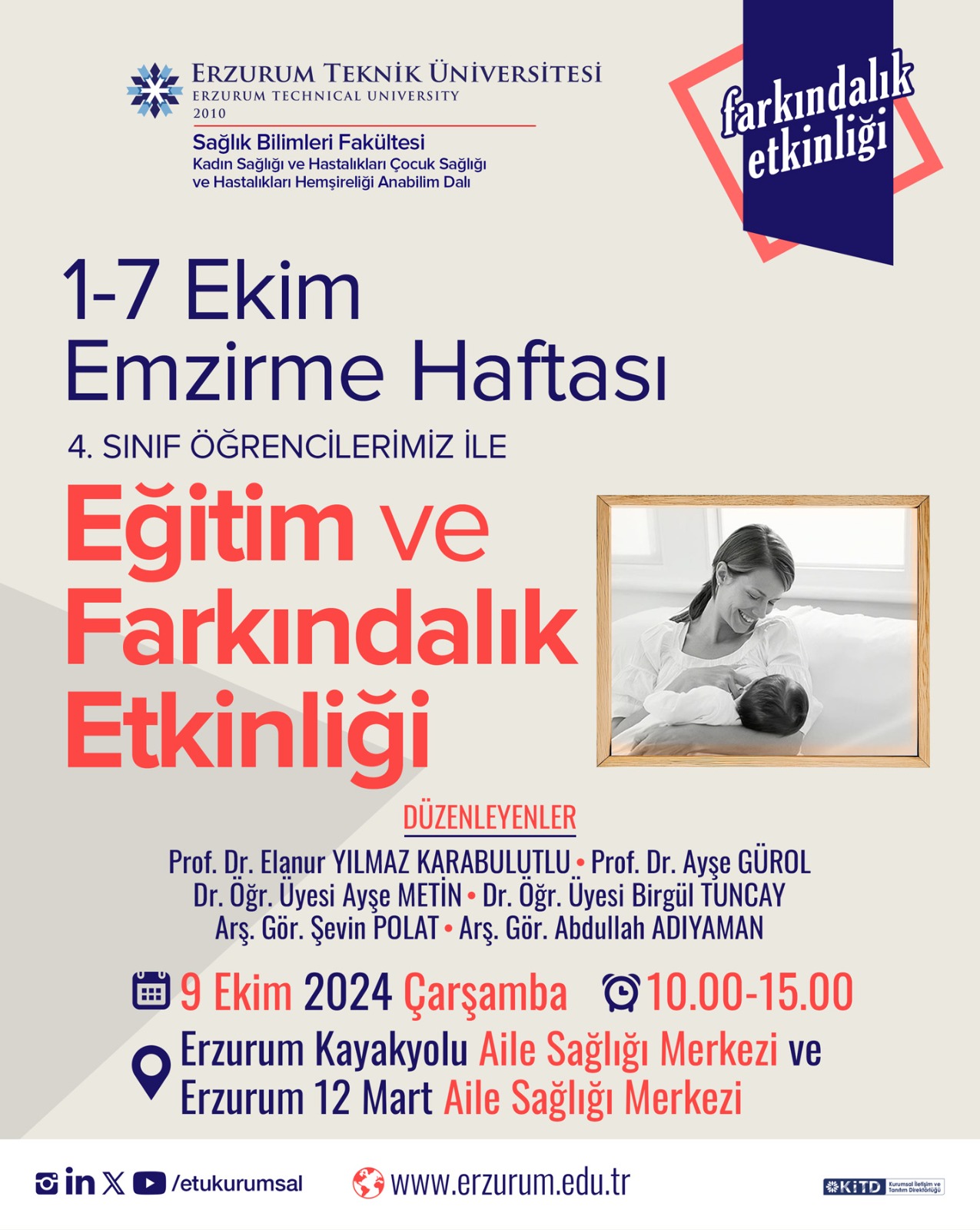 Sağlık Bilimleri Fakültesi Kadın Sağlığı ve Hastalıkları/Çocuk Sağlığı ve Hastalıkları Hemşireliği Anabilim Dalı, 1-7 Ekim Emzirme Haftası kapsamında, 09.10.2024 tarihinde 10.00- 15.00 saatleri aralığında Erzurum Kayakyolu Aile Sağlığı Merkezi ve Erzurum 12 Mart Aile Sağlığı Merkezi'nde, fakültemiz 4. sınıf öğrencileri ile birlikte emzirme eğitimine dair stant kurarak eğitim ve farkındalık etkinliği düzenleyecektir.