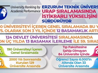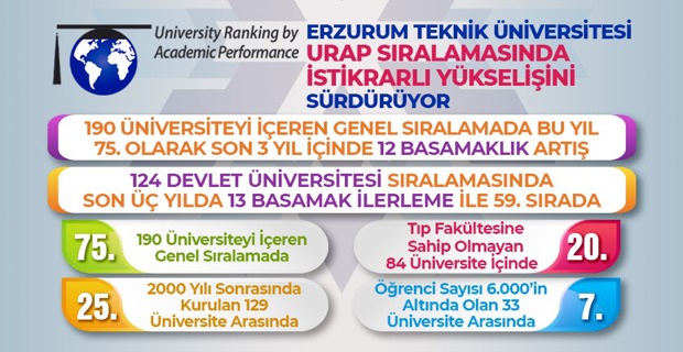 Erzurum Teknik Üniversitesi (ETÜ), yükseköğretim kurumlarının akademik performanslarına göre değerlendirildiği URAP (University Ranking by Academic Performance) sıralamasında kaydettiği istikrarlı yükselişle dikkat çekiyor. URAP’ın 190 üniversiteyi içeren genel sıralamasında ETÜ, bu yıl 75. sıraya yerleşerek akademik performansını güçlü bir şekilde ortaya koydu. Son üç yıl içinde 12 basamaklık bir artış sergileyen üniversite, akademik başarı çıtasını istikrarlı bir şekilde yükseltmektedir.