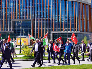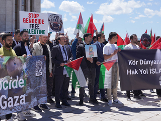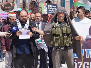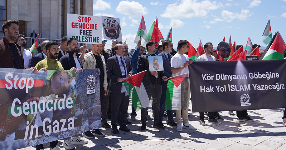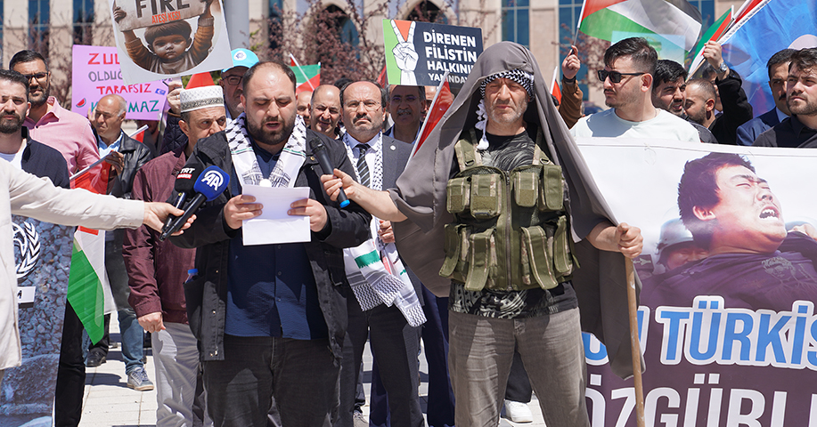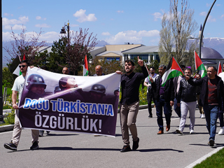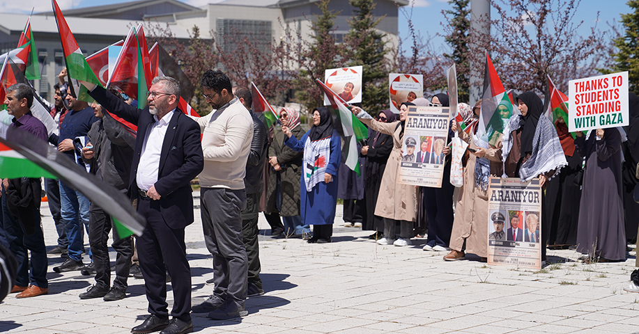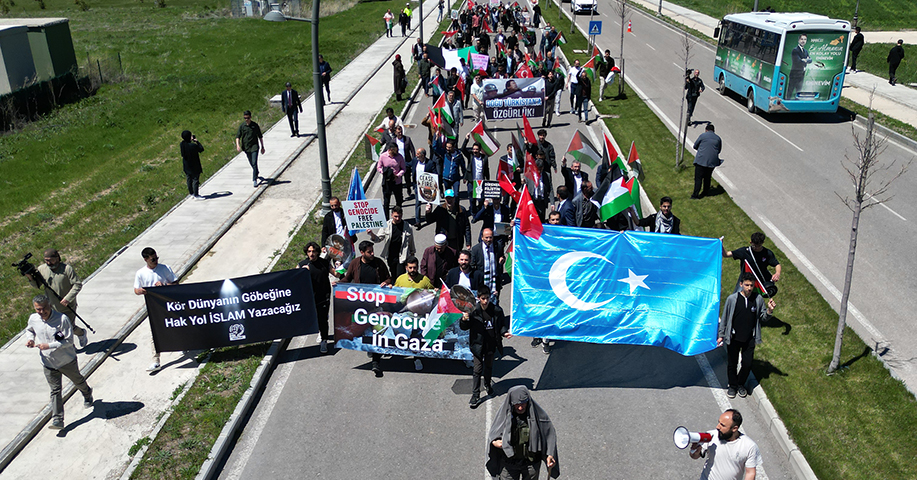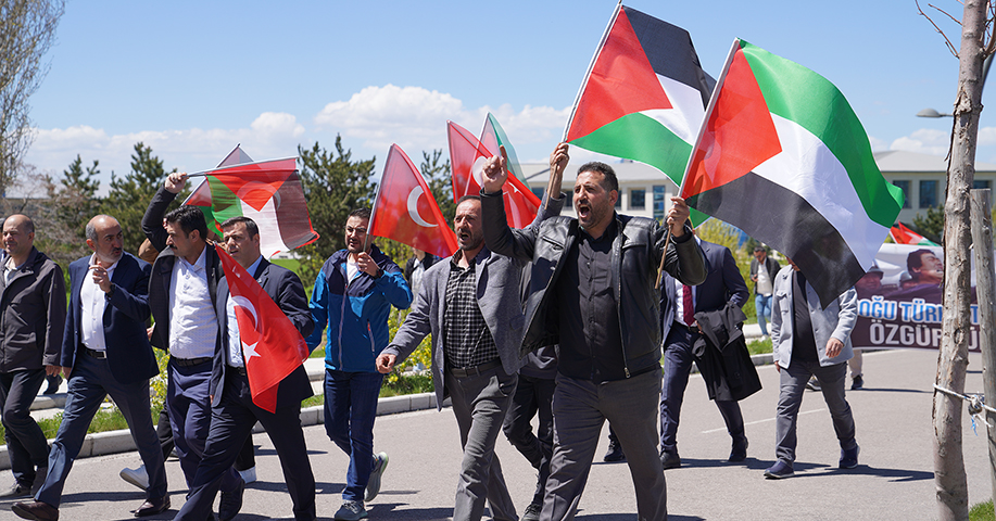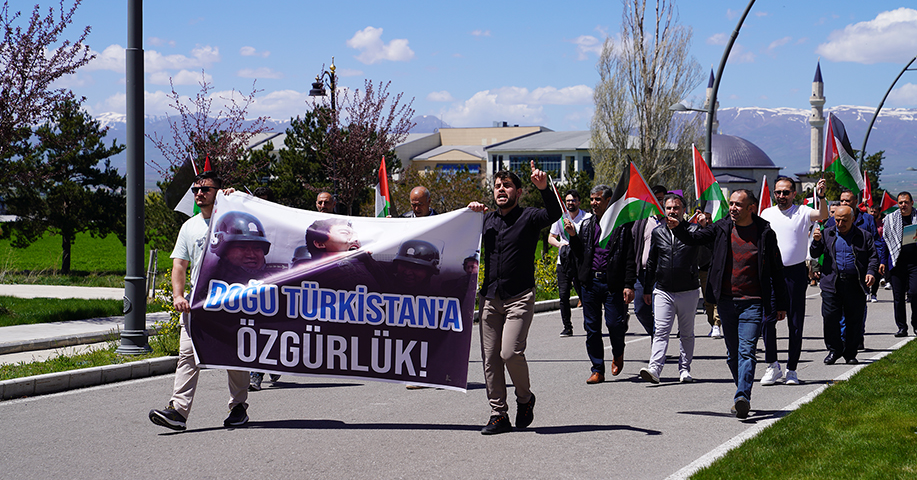 Cuma namazının ardından başlayan yürüyüşte katılımcılar Türk Bayrağı, Filistin Bayrağı ve Doğu Türkistan Bayrağı’nın yanı sıra çeşitli dövizler taşırken “Nehirden Denize Özgür Filistin, Doğu Türkistan Yalnız Değildir ve Susma, Zulme Sessiz Kalma” sloganları eşliğinde Rektörlük binası önüne yürüdü.