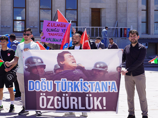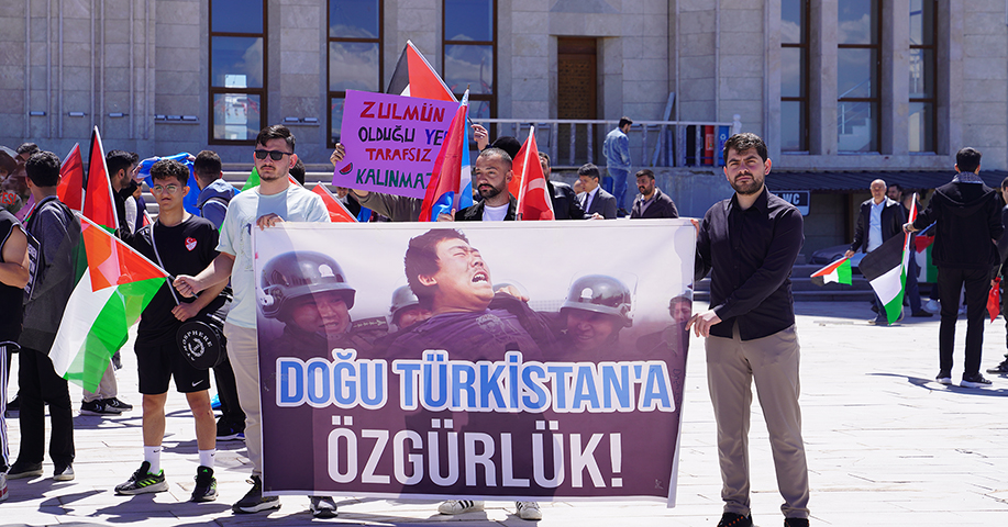 Rektörlük önünde basın açıklamasında bulunan gençler, Gazze’de sivillere yönelik saldırıların uluslararası hukuku hiçe saydığını ve Doğu Türkistan’da yıllardır sistematik olarak devam eden kültürel asimilasyona sessiz kalınmaması gerektiği ifade etti.