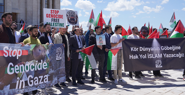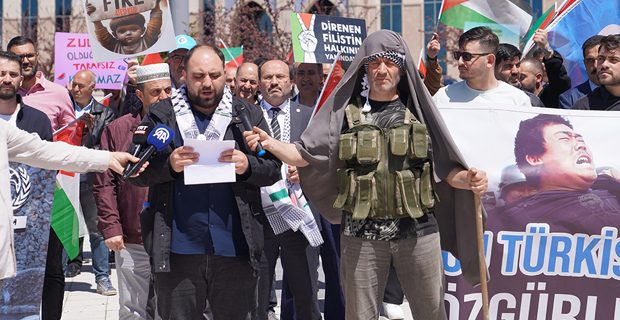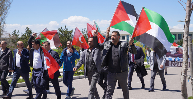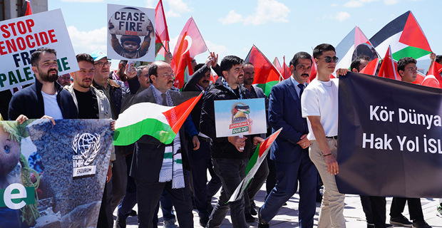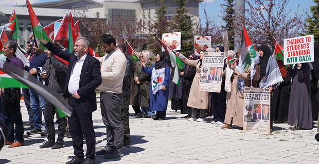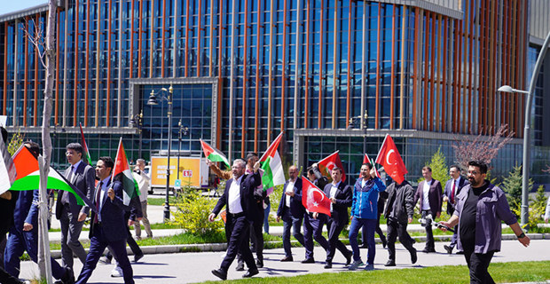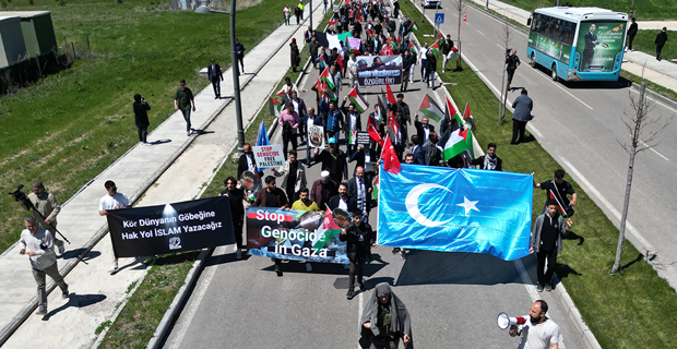 Cuma namazının ardından başlayan yürüyüşte katılımcılar Türk Bayrağı, Filistin Bayrağı ve Doğu Türkistan Bayrağı’nın yanı sıra çeşitli dövizler taşırken “Nehirden Denize Özgür Filistin, Doğu Türkistan Yalnız Değildir ve Susma, Zulme Sessiz Kalma” sloganları eşliğinde Rektörlük binası önüne yürüdü.