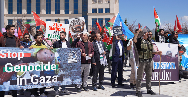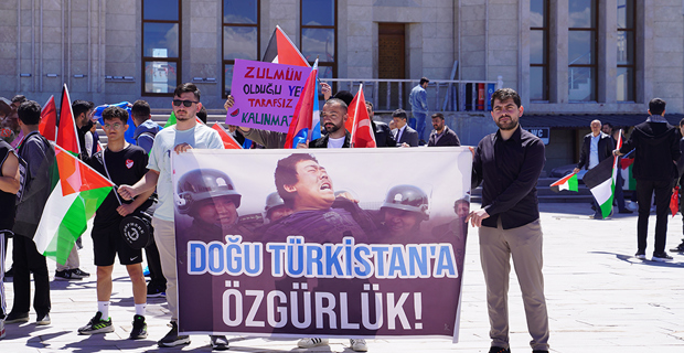 Rektörlük önünde basın açıklamasında bulunan gençler, Gazze’de sivillere yönelik saldırıların uluslararası hukuku hiçe saydığını ve Doğu Türkistan’da yıllardır sistematik olarak devam eden kültürel asimilasyona sessiz kalınmaması gerektiği ifade etti.