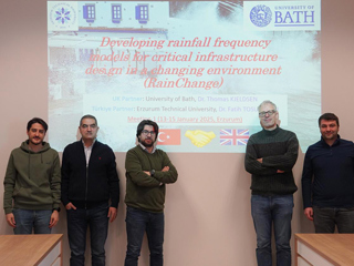 Erzurum Teknik Üniversitesi (ETÜ) Mühendislik ve Mimarlık Fakültesi İnşaat Mühendisliği bölümü öğretim üyelerinden Prof. Dr. Fatih Tosunoğlu ile İngiltere’nin Bath Üniversitesi İnşaat Mühendisliği Bölümü öğretim üyelerinden Dr. Thomas Kjeldsen’in yürütücü oldukları “Developing rainfall frequency models for critical infrastructure design in a changing environment RainChange (Değişen iklim koşullarında kritik öneme sahip altyapı tasarımları için yağış frekans modellerinin geliştirilmesi)” başlıklı projenin birinci gelişme toplantısı ETÜ ev sahipliğinde gerçekleştirildi.