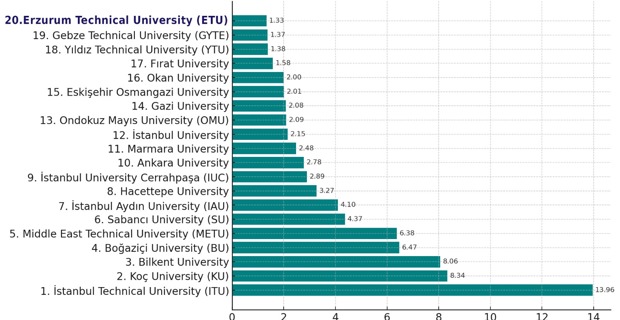 Erzurum Technical University (ETU) achieved a significant success by being ranked in the top 20 among Turkish universities in the 2025 list of the Nature Index, one of the respected rankings based on scientific publication performance worldwide.