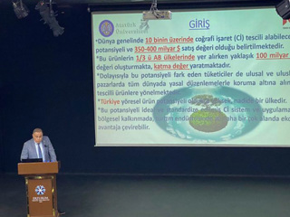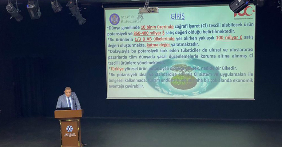Çomaklı’nın ardından konuşan Atatürk Üniversitesi Sosyal Bilimler Meslek Yüksek Okulu Turizm ve Otel İşletmeciliği Programı öğretim elemanlarından Öğr. Gör. Dr. Erkan Denk, Türkiye’nin yöresel ürün potansiyelinin oldukça yüksek olduğunu belirterek, coğrafi işaretli ürünlerin nitelikleri ve özellikleri hakkında dinleyicilere bilgiler verdi.