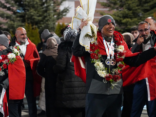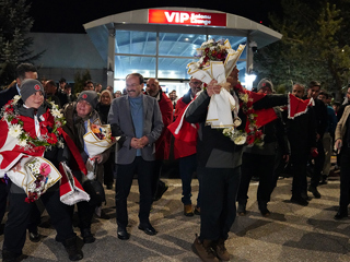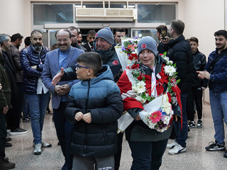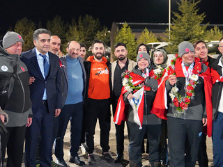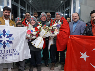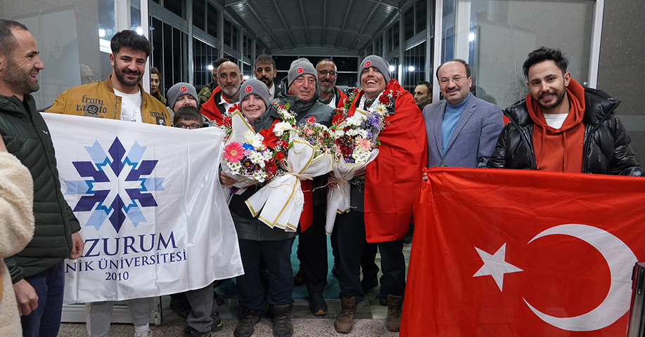 Fransa’dan çifte madalya ile Erzurum’a dönen ikiz kardeşler için havalimanında karşılama töreni düzenlenirken alanda ETÜ Rektörü Prof. Dr. Bülent Çakmak’ın yanı sıra çok sayıda akademisyen ve öğrenci yer aldı.