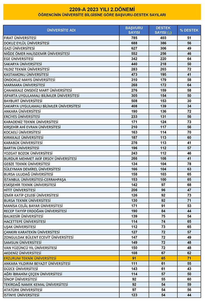 TÜBİTAK Bilim İnsanı Destek Programları Başkanlığı (BİDEB) tarafından yürütülen “2209-A Üniversite Öğrencileri Araştırma Projeleri Destekleme Programı” 2023/2 dönemi kapsamında yapılan başvuruların sonuçlarına göre Erzurum Teknik Üniversitesi %71’lik kabul oranıyla önemli bir başarıya imza attı.