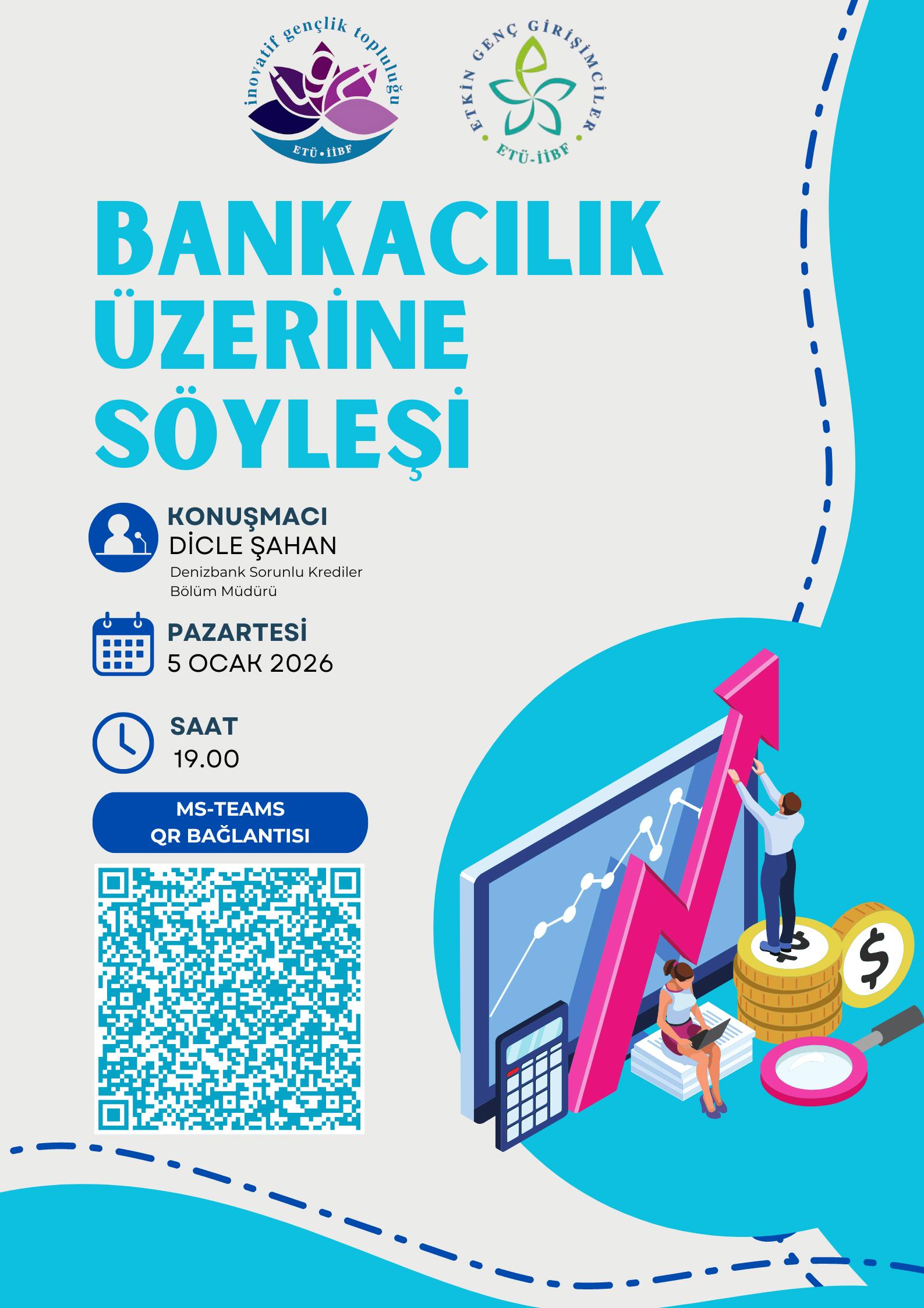 Fakültemiz bünyesinde faaliyet gösteren İnovatif Gençlik Topluluğu ve Etkin Genç Girişimciler Topluluğu tarafından fakültemiz öğrencilerinin bankacılık ve finans alanındaki teorik bilgilerini sektör uygulamalarıyla pekiştirmelerini sağlamak amacıyla düzenlenen Bankacılık Söyleşisi, 5 Ocak 2026 tarihinde saat 19.00’da Microsoft Teams platformu üzerinden çevrim içi olarak gerçekleştirildi.