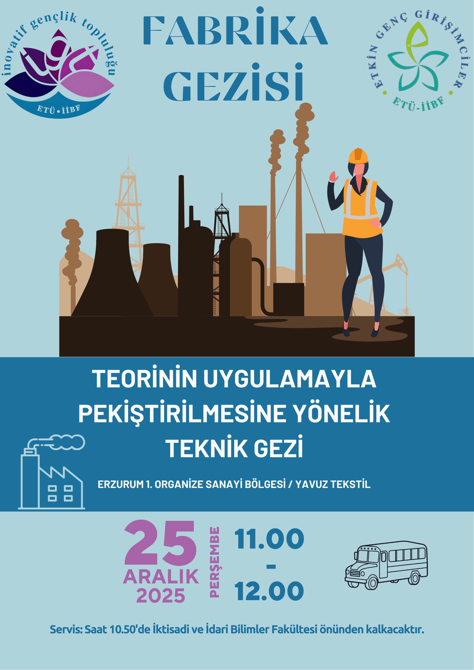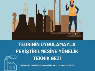 Fakültemiz bünyesinde faaliyet gösteren İnovatif Gençlik Topluluğu ile Etkin Genç Girişimciler Topluluğu tarafından, öğrencilerin teorik bilgilerini uygulama ile pekiştirmelerini sağlamak amacıyla 25 Aralık 2025 tarihinde Erzurum 1. Organize Sanayi Bölgesinde faaliyet gösteren Yavuz Tekstil fabrikasına teknik gezi düzenlenmiştir.