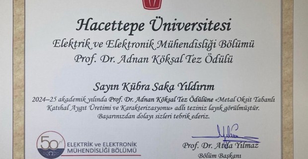 Fakültemiz Elektrik Elektronik Mühendisliği Bölümü öğretim elemanlarından Arş. Gör. Dr. Kübra Saka Yıldırım, Hacettepe Üniversitesi Elektrik ve Elektronik Mühendisliği bölümü tarafından Tez Ödülüne layık görülmüştür.