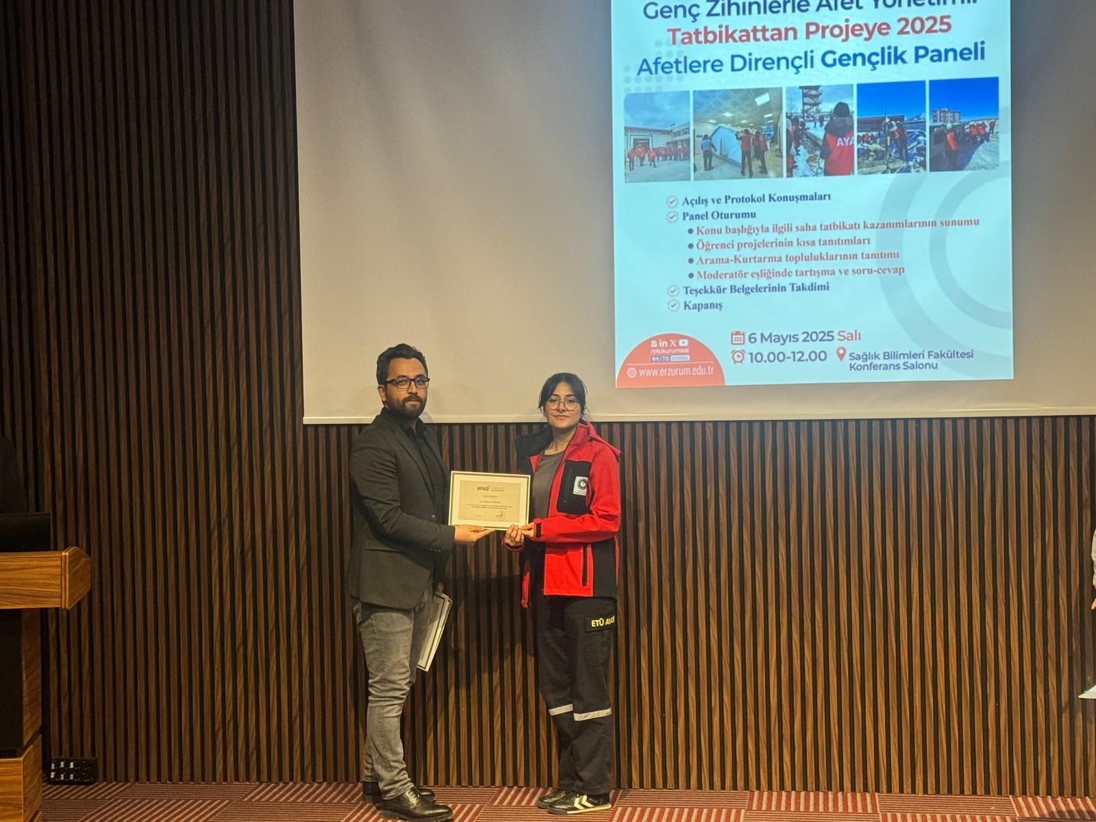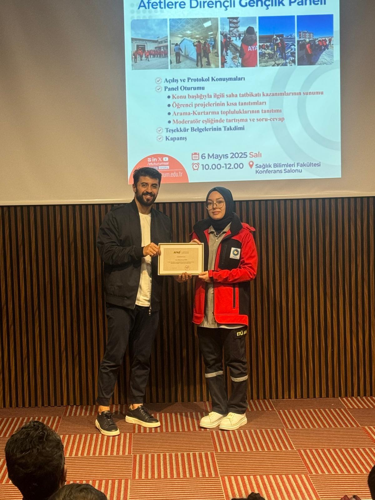 Acil Yardım ve Afet Yönetimi Bölümü olarak düzenlediğmiz "Genç Zihinlerle Afet Yönetimi: Tatbikattan Projeye 2025 Afetlere Dirençli Gençlik Paneli" başarılı bir şekilde gerçekleştirilmiştir. Panelimiz, Ekonomik İşbirliği Teşkilatı 2025 Kış Saha Tatbikatı kazanımları ile başlamış, bölümümüz öğrencilerinin ÜNİDES ve TÜBİTAK kapsamında destek almaya hak kazanan projelerinin ve Arama Kurtarma Topluluğu'nun tanıtımı ile devam etmiş, tatbikat sebebi ile öğrencilerimize teşekkür belgelerinin takdimi ile sonlanmıştır.