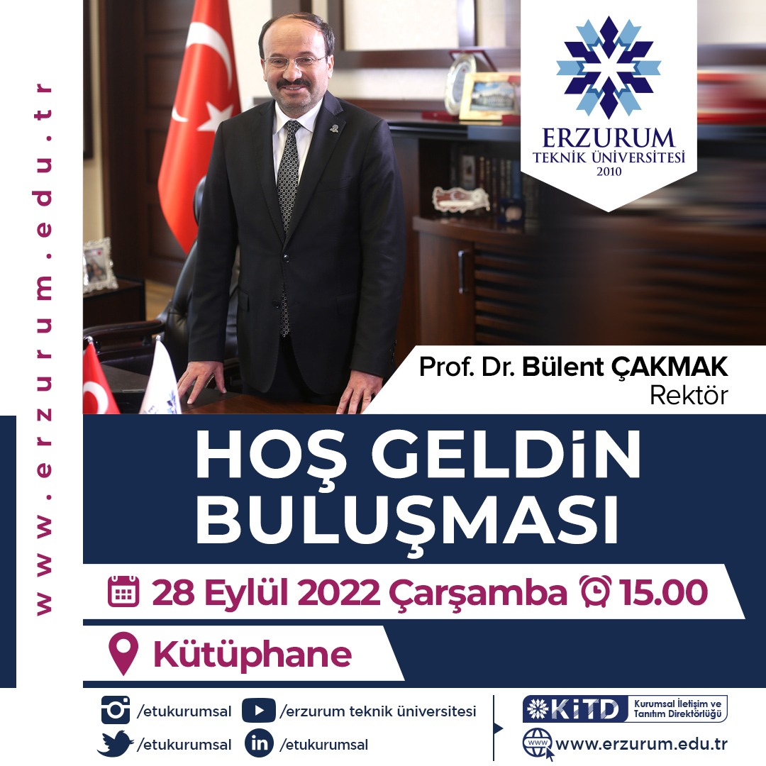 Rektörümüz Prof. Dr. Bülent Çakmak'ın katılımıyla gerçekleştirilecek olan 2022-2023 Akademik Yılı "Hoş Geldin Buluşması" 28.09.2022 Çarşamba günü saat 15.00'de Merkezi Kütüphanemizde yapılacaktır. Tüm öğrencilerimiz davetlidir.