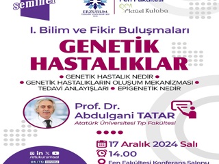A program titled "Genetic Diseases" will be organized by the GENAKTÜEL Club operating within our faculty, with the presentation of Prof. Dr. Gani TATAR, within the scope of the "I. Science and Idea Meetings" program, on Tuesday, 09.12.2024 at 14:00 in our faculty conference hall.