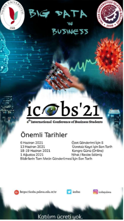 Yalova Üniversitsi İktisadi ve İdari Bilimler Fakültesi İşletme Bölümü tarafından 18-19 Haziran 2021 tarihlerinde online olarak düzenlenecek olan "6. Uluslararası İşletme Öğrencileri" konferansı ile ilgili ayrıntılı bilgiye İşletme Bölümü web sayfasından (isletme.yalova.edu.tr) veya ICOBS'21 (icobs.yalova.edu.tr) internet adresinden ulaşılabilecektir.