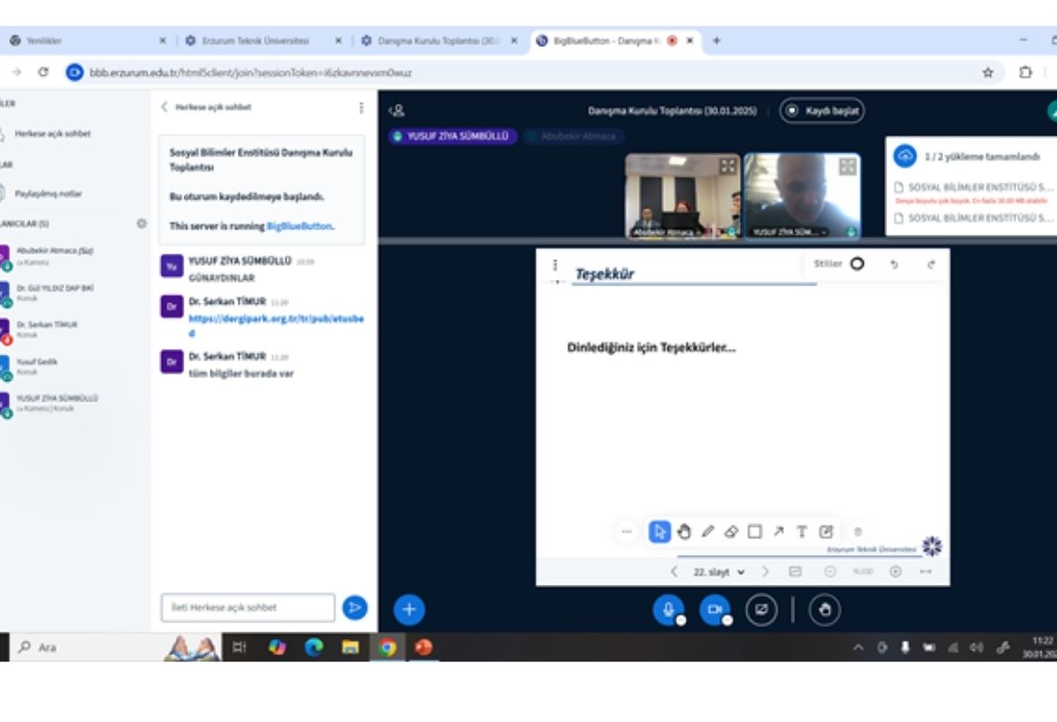 2024-2025 Eğitim-Öğretim Yılı bahar yarıyılı hazırlık çalışmaları kapsamında 30.01.2025 tarihinde Sosyal Bilimler Enstitü Müdürü Prof. Dr. Serap BEDİR KARA başkanlığında Danışma Kurulu üyeleri ile online ve yüz yüze katılımlı “2024-2025 Öğretim Yılı II. Danışma Kurulu Toplantısı” gerçekleştirilmiştir.