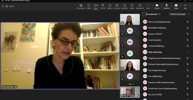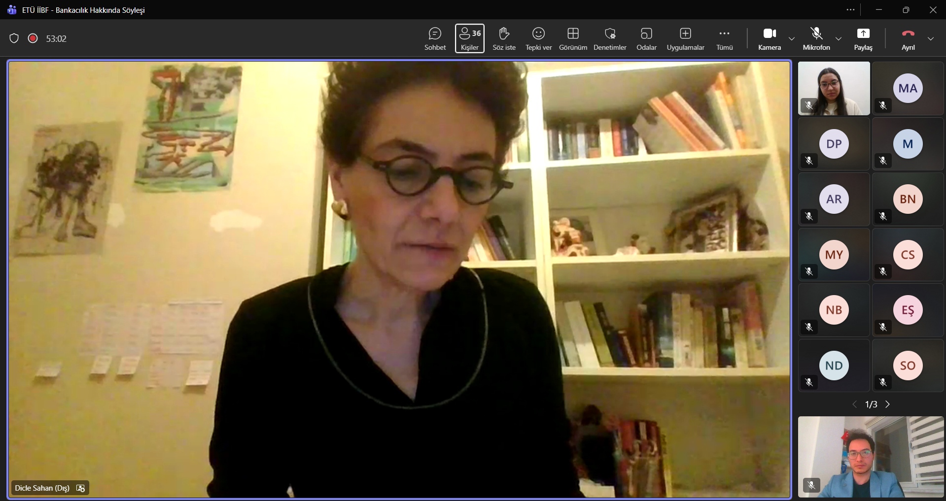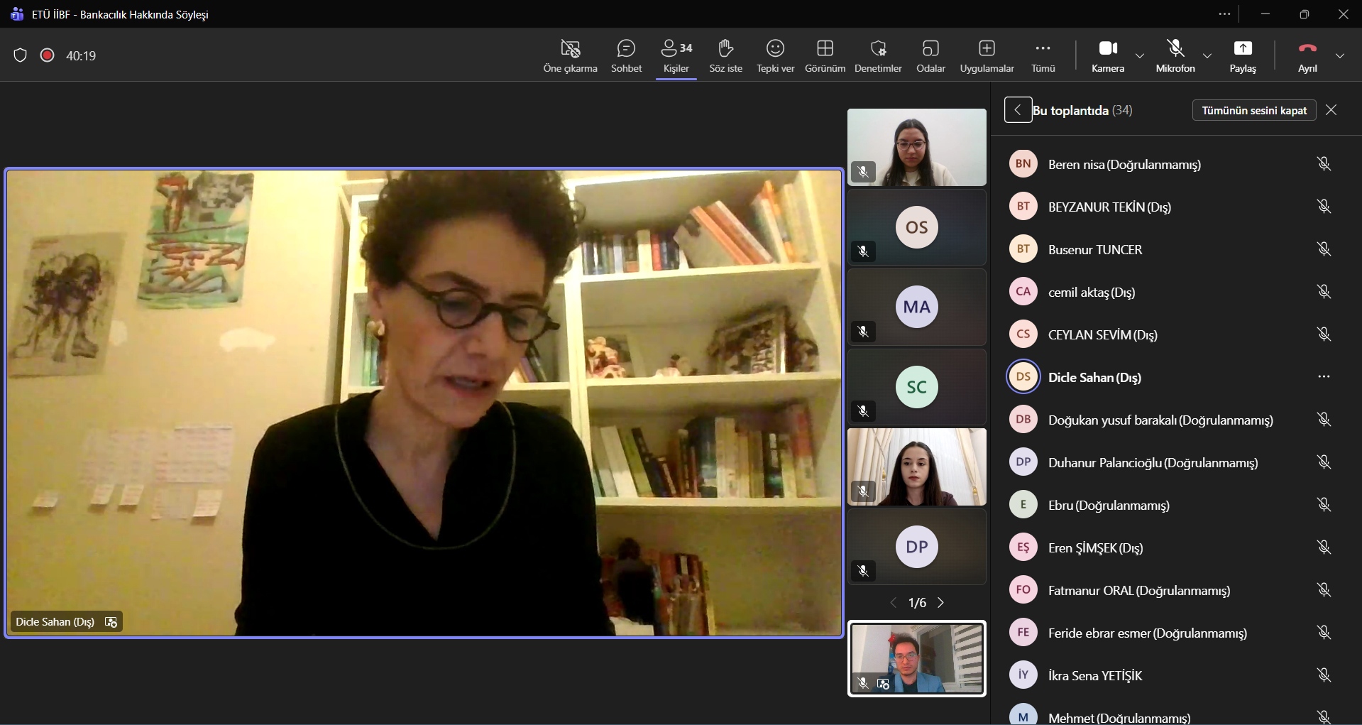 Söyleşinin davetli konuşmacısı, DenizBank Sorunlu Krediler Bölüm Müdürü Dicle Şahan oldu. Etkinlik kapsamında bankaların organizasyon yapısı, bankacılık hizmetleri, kariyer planlaması ve insan kaynakları uygulamaları hakkında katılımcı öğrencilere kapsamlı bilgiler aktarıldı.