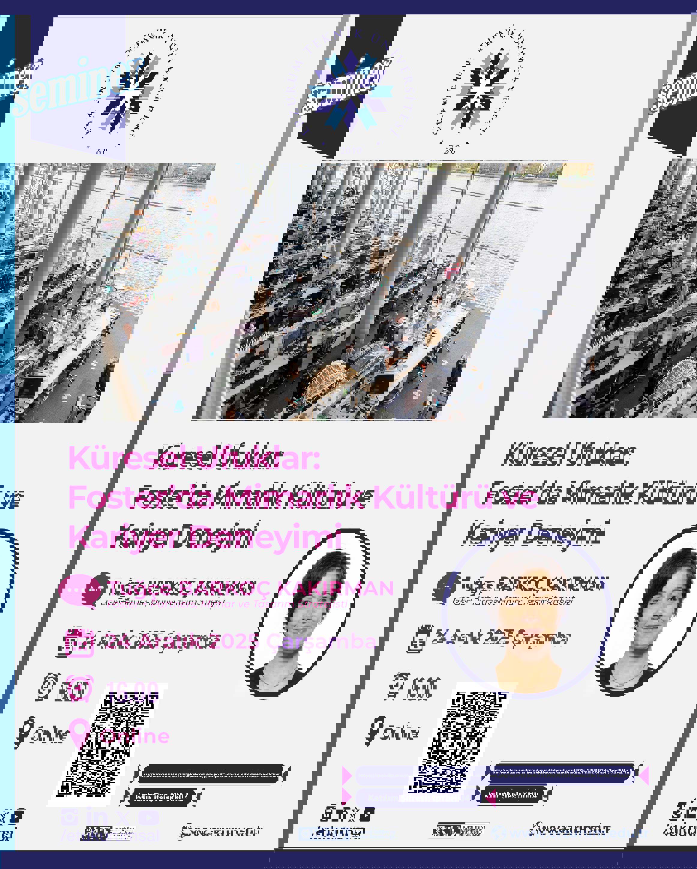 Erzurum Teknik Üniversitesi Mimarlık Bölümü ev sahipliğinde düzenlenen seminer kapsamında, uluslararası ölçekte önemli projelere imza atan Foster + Partners bünyesinde Mimar ve Tasarım Stratejisti olarak görev yapan Tuğçe Barkoç Kakırman, mimarlık pratiğinde küresel ölçekte çalışma kültürü ve kariyer deneyimlerini paylaşacaktır.