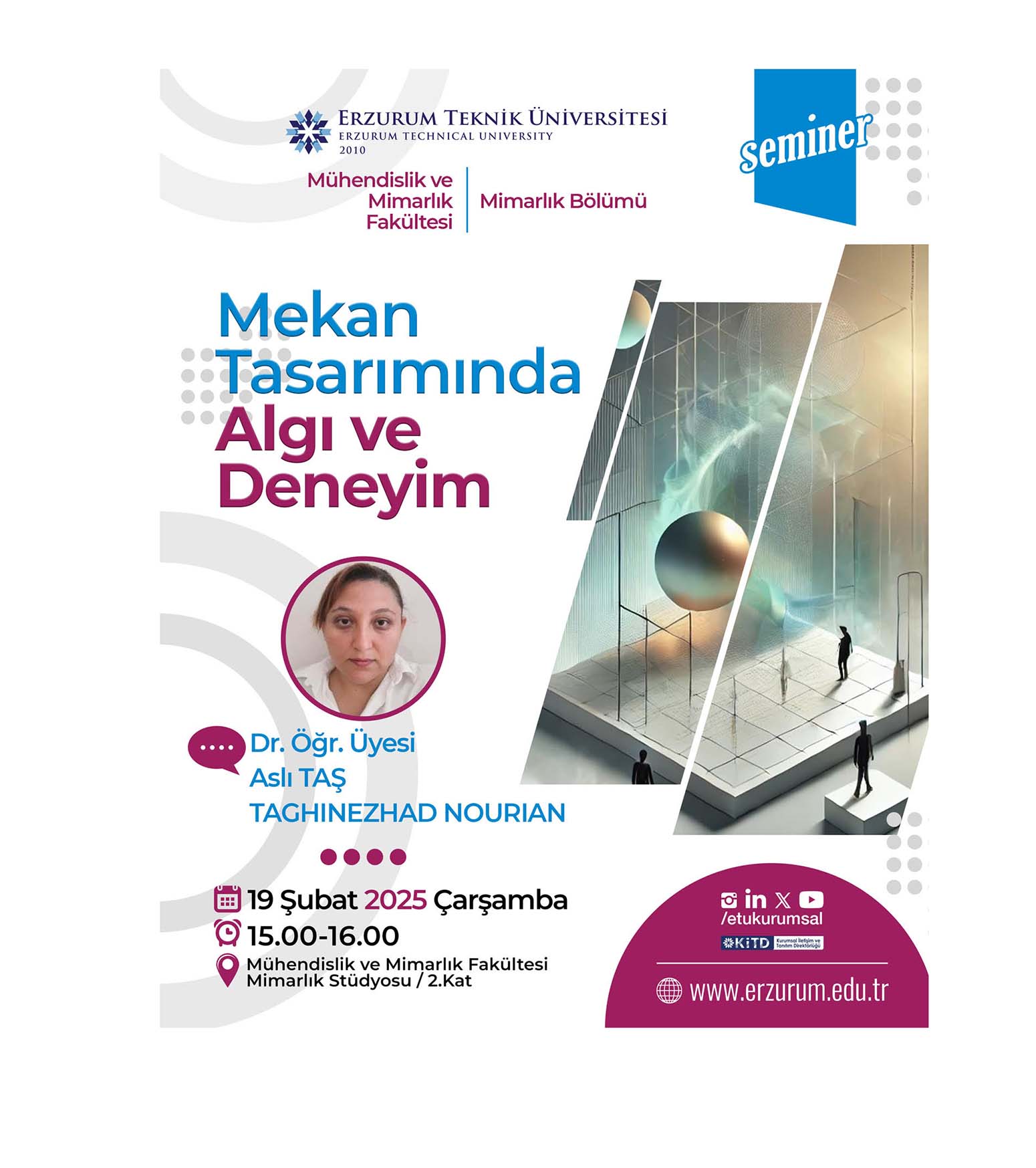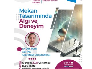 Bölümümüz Dr. Öğr. Üyesi Aslı TAŞ TAGHINEZHAD NOURIAN hocamızın "Mekan Tasarımında Algı ve Deneyim" adlı seminer sunumu 19.02.2025 Çarşamba günü saat 15:00'da mimarlık stüdyosunda yapılacaktır. Tüm üniversitemiz davetlidir.
