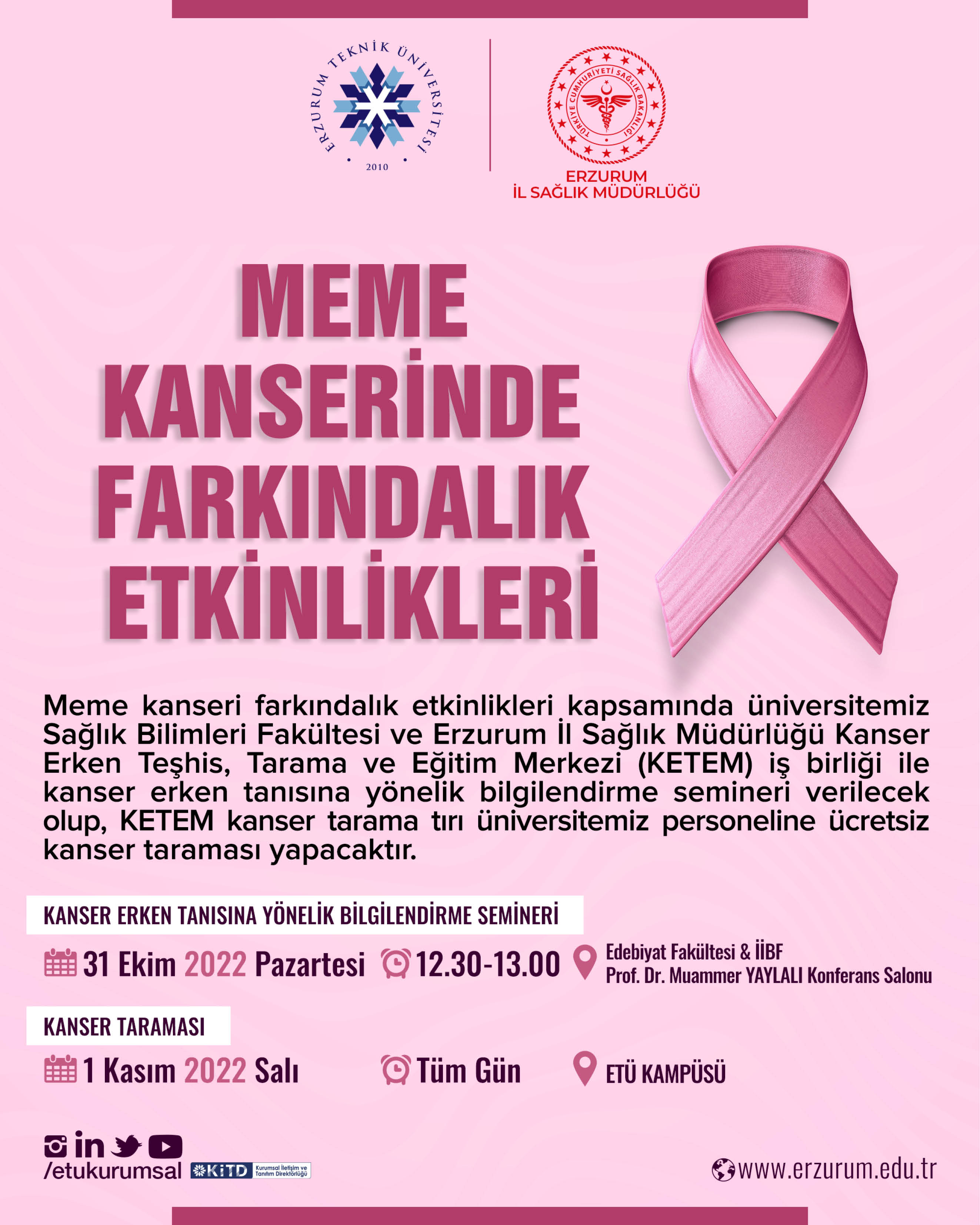 Meme kanseri farkındalık etkinlikleri kapsamında üniversitemiz Sağlık Bilimleri Fakültesi ve Erzurum İl Sağlık Müdürlüğü Kanser Erken Teşhis, Tarama ve Eğitim Merkezi (KETEM) iş birliği ile kanser erken tanısına yönelik bilgilendirme semineri verilecek olup, KETEM kanser tarama tırı üniversitemiz personeline ücretsiz kanser taraması yapacaktır.
