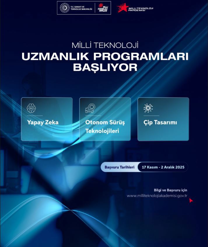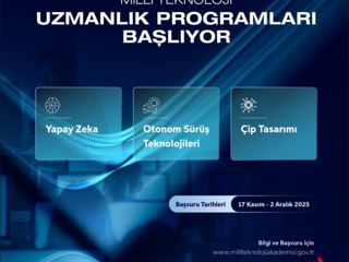 Milli Teknoloji Uzmanlık Programları 3. ve 4. sınıf üniversite öğrencilerini kapsayarak, ilgili alanlarda ülkemizin önde gelen firma ve kurumları ile iş birliği içerisinde yürütülecektir. Programlar; temel eğitim, uzmanlık eğitimi, bitirme projesi ve staj olmak üzere dört ana bölümden oluşmaktadır. Öğrenciler ilgili alanlarda kendilerini geliştirmek için temel ve uzmanlık eğitimlerini tamamlayarak, staj ve mentörlük desteklerinden faydalanabilecek ve edindikleri bilgileri sektörde pratiğe dönüştürme imkânı bulacakları staj programlarına hak kazanabileceklerdir. Bu doğrultuda 17.11.2025 tarihinde başlayan Milli Teknoloji Uzmanlık Programları başvuruları 02.12.2025 tarihinde sonlanacaktır. Programa ait başvuru kabul kriterleri, eğitim müfredatı gibi daha detaylı bilgiler www.milliteknolojiakademisi.