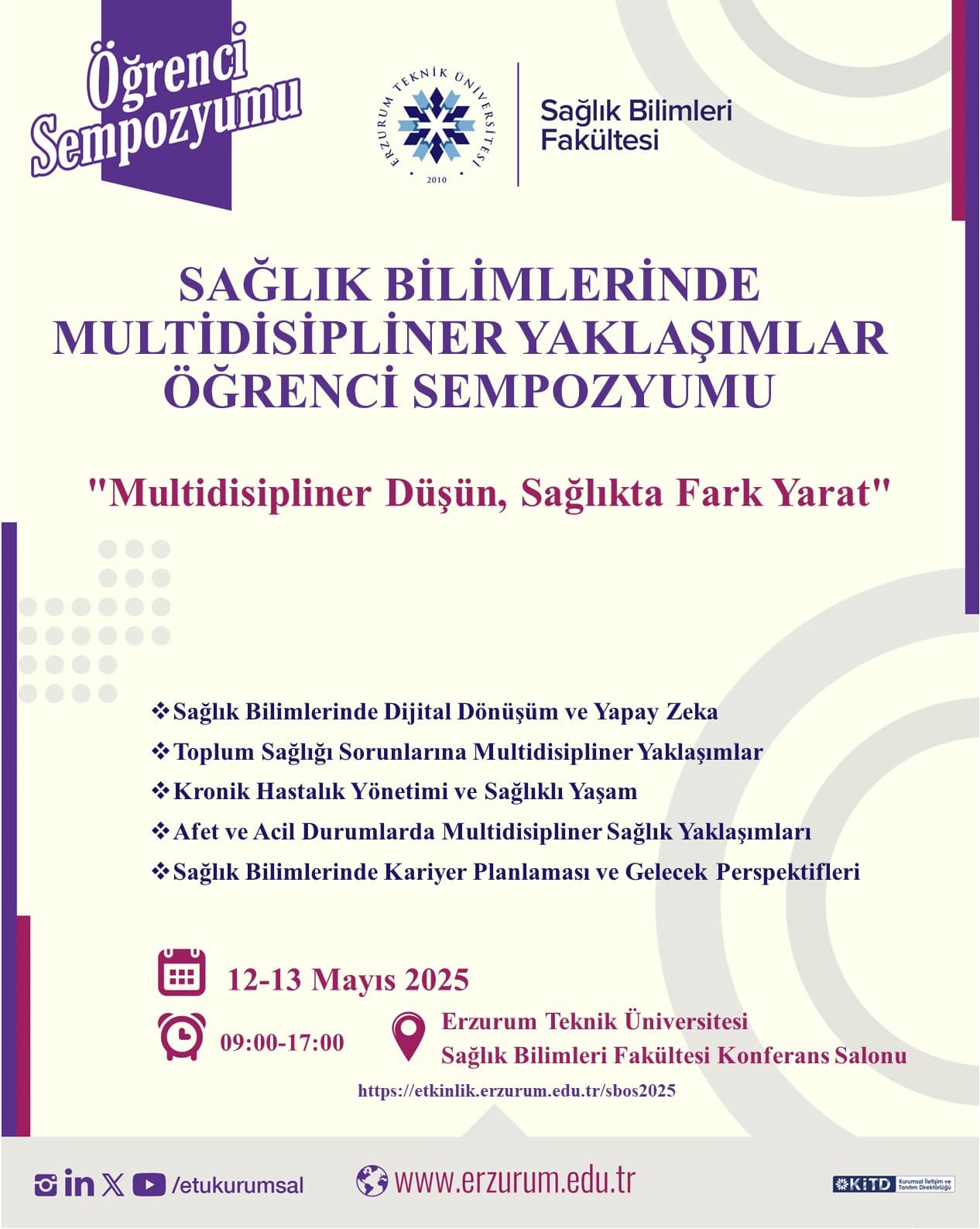 Erzurum Teknik Üniversitesi Sağlık Bilimleri Fakültesi tarafından 12-13 Mayıs 2025 tarihlerinde Sağlık Bilimlerinde Multidisipliner Yaklaşımlar Öğrenci Sempozyumu düzenlenecektir.