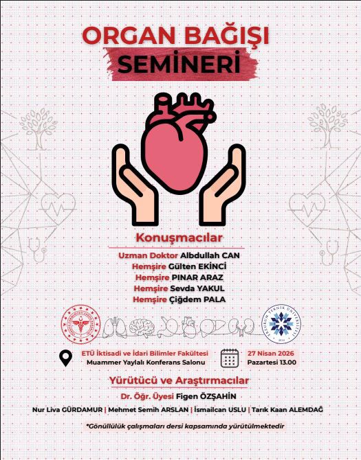USD064 Gönüllülük Çalışmaları dersi kapsamInda Dr. Öğr. Üyesi Figen ÖZŞAHİN yürütücülüğünde 27.04.2026 tarihinde saat 13.00 de İİBF-Muammer Yaylalı Konferans salonunda ‘’Organ Bağışı Semineri’’ düzenlenecektir.