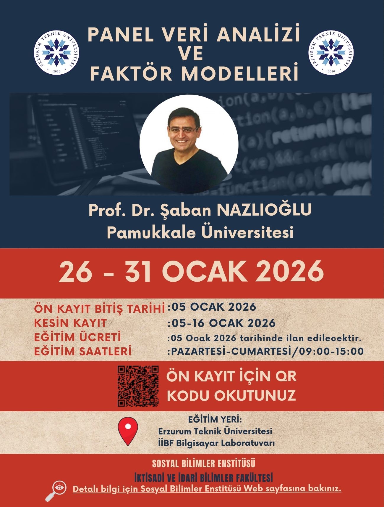Prof. Dr. Şaban Nazlıoğlu tarafından 26-31 Ocak 2026 tarihinde verilecek olan Panel Veri Analizi ve Faktör Modelleri Eğitimi kesin kayıt süreci başlamıştır. Eğitime katılan tüm katılımcılara, GAUSS yazılımının orijinal sürümü 2 yıl süreyle ücretsiz olarak sağlanacaktır.