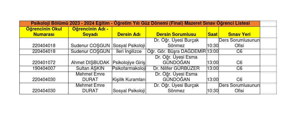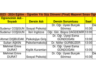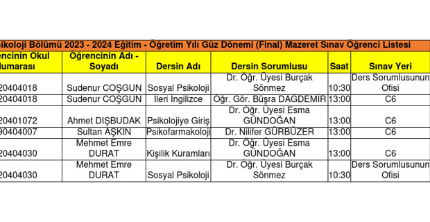 2023-2024 eğitim-öğretim yılı güz yarıyılında, ekte belirtilen öğrencilerin final mazeret sınavları, Sosyal Psikoloji dersi hariç, 05 Şubat 13.00 tarihinde C6 dersliğinde gerçekleştirilecektir. Sosyal Psikoloji dersi mazeret sınavı ise 05 Şubat 10.30 tarihinde ders sorumlusunun ofisinde gerçekleştirilecektir.