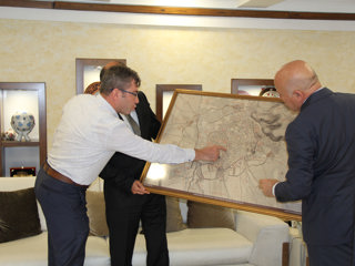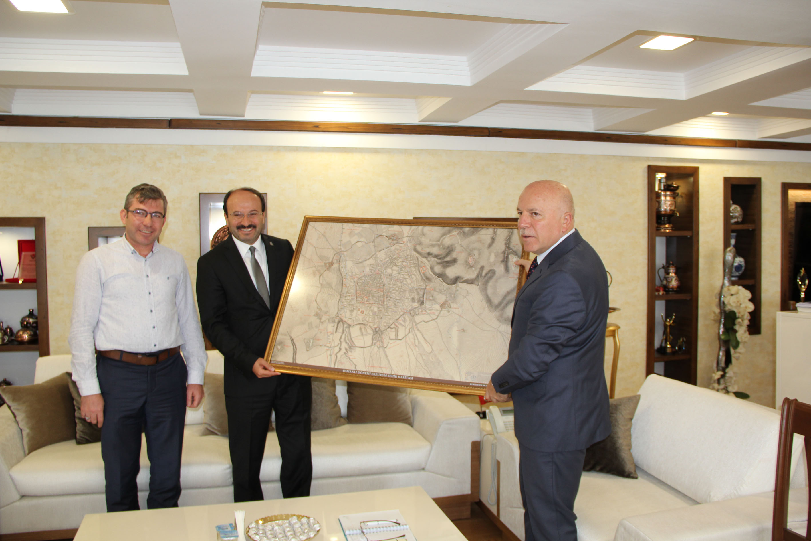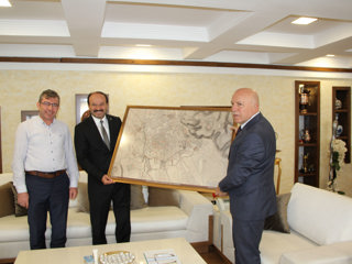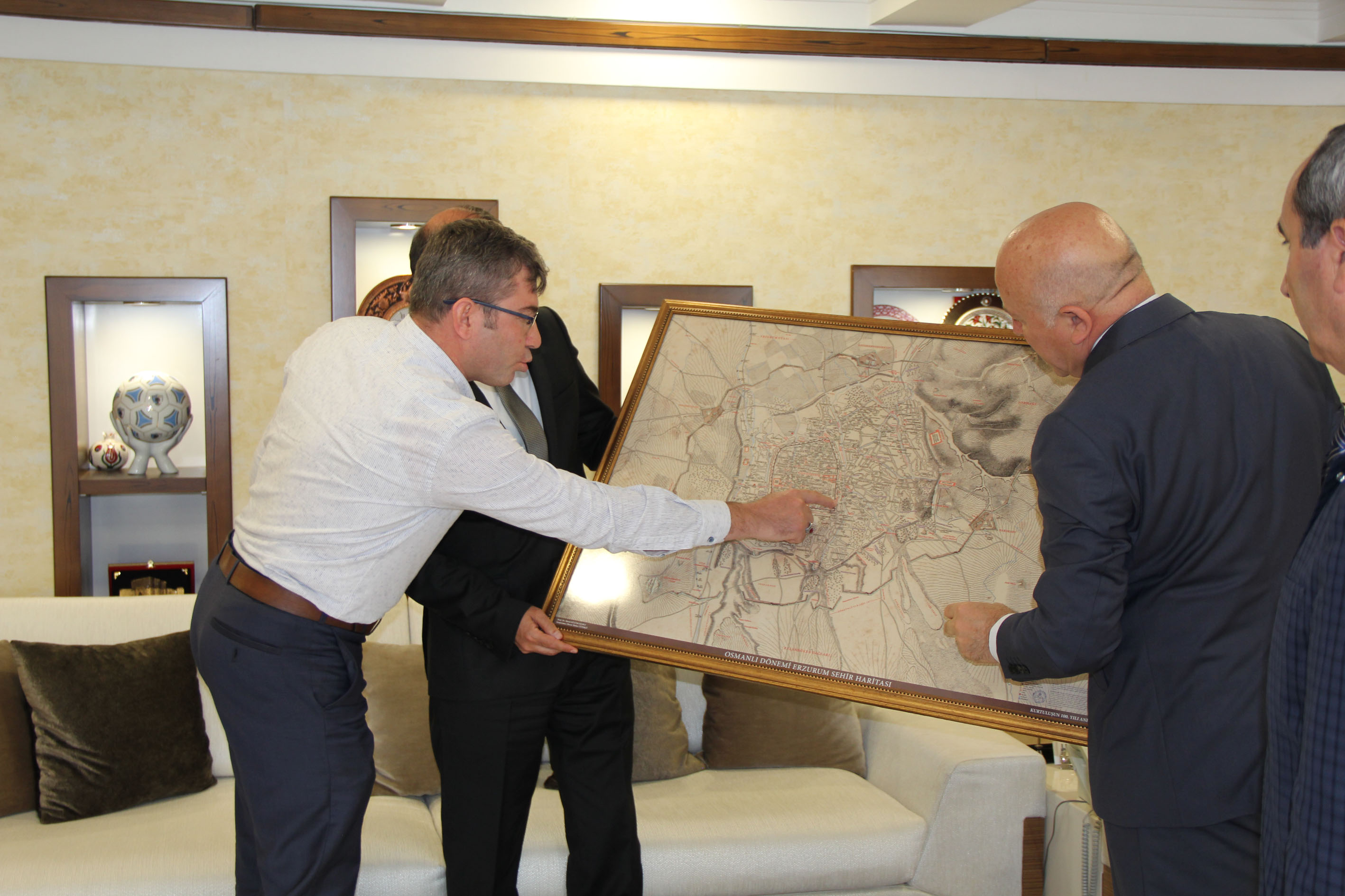 Konuklarını makamında ağırlayan Erzurum Büyükşehir Belediye Başkanı Sekmen’e Erzurum Teknik Üniversitesi Rektör Yardımcısı, aynı zamanda Erzurum Şehir Arşivi (ERŞA) kurucularından Prof. Dr. Murat Küçükuğurlu ve araştırmacı Murat Türker Tüfekçi’nin yoğun çalışmalarıyla hazırlanan Osmanlı döneminden günümüze 400 yıllık "Erzurum Şehir Haritası" ve "100. Yılında Fotoğraf ve Belgelerle Erzurum Kongresi Albümü" takdim edildi.