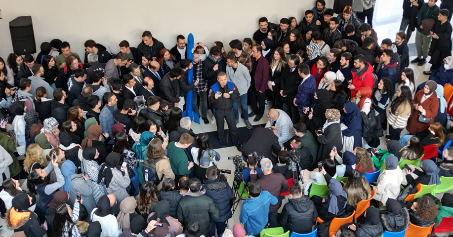 Programın açılış konuşmasını yapmak üzere kürsüye çıkan Rektör Bülent Çakmak, Milli Uzay Programı’nın Türkiye’nin uzay çalışmaları açasından önemli bir kilometre taşı olduğunu belirterek: “Bu yıl Mühendislik ve Mimarlık Fakültemiz bünyesinde yer alan Havacılık ve Uzay Mühendisliği Bölümümüze ilk öğrencilerimizi aldık. Şu an salonda bulunan ve Havacılık ve Uzay Mühendisliği bölümünde okuyan genç arkadaşlarımız sanıyorum ki sizlerin gelişinden en çok heyecanlananlardır. Üniversite olarak bu alandaki yetkinliğimiz TÜBİTAK tarafından yayınlanan ve üniversitelerin yetkinlik haritasını çıkaran çalışmalarda bir kez daha teyit edilmiştir. TÜBİTAK tarafından gerçekleştirilen bu çalışmada üniversitemiz, Havacılık alanında birinci bölgede yer almıştır. Ayrıca Sanayi ve Teknoloji Bakanlığımızın desteğiyle kurulan Kristal Girişimcilik Merkezimizde faaliyetlerini sürdüren teknoloji takımlarımızdan biri NASA’nın sponsorluğunda düzenlenen CANSAT Model Uydu Yarışmasında 97,7 puan alarak Türkiye’de 3. Dünyada ise 11. olarak hepimizi gururlandırmıştır. Sizler ülkemizin geleceğinin teminatısınız. Dünyada yaşanan zulümlere şahit oluyorsunuz. Güçlü olanın maalesef her istediğini yapabildiği adil olmayan bir dünyada yaşıyoruz. Bu nedenle sizlere düşen görev işinizi en iyi şekilde yapmak ve sizlere sunulan imkanların kıymetini bilmektir. Görüyorsunuz Gazze’de ne okul ne üniversite ne mabet ne de hastane kaldı. Biz ne kadar güçlü olursak mazlumların yükselen sesi olmaya o kadar devam ederiz. Sizlere güveniyor, ülkemizin yarınlarını inşa edeceğinize gönülden inanıyoruz” diye konuştu.
