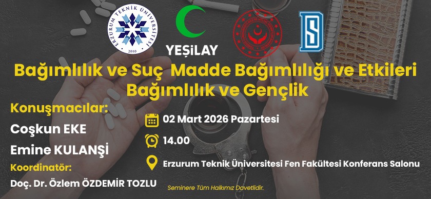 Bağımlılık ve Suç Madde Bağımlılığı ve Etkileri Bağımlılık ve Gençlik Semineri, 02 Mart 2026 tarihinde saat 14.00’te fakültemiz konferans salonunda gerçekleştirilecektir.