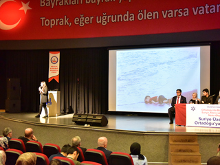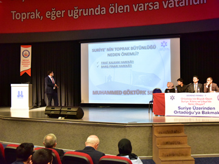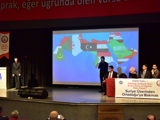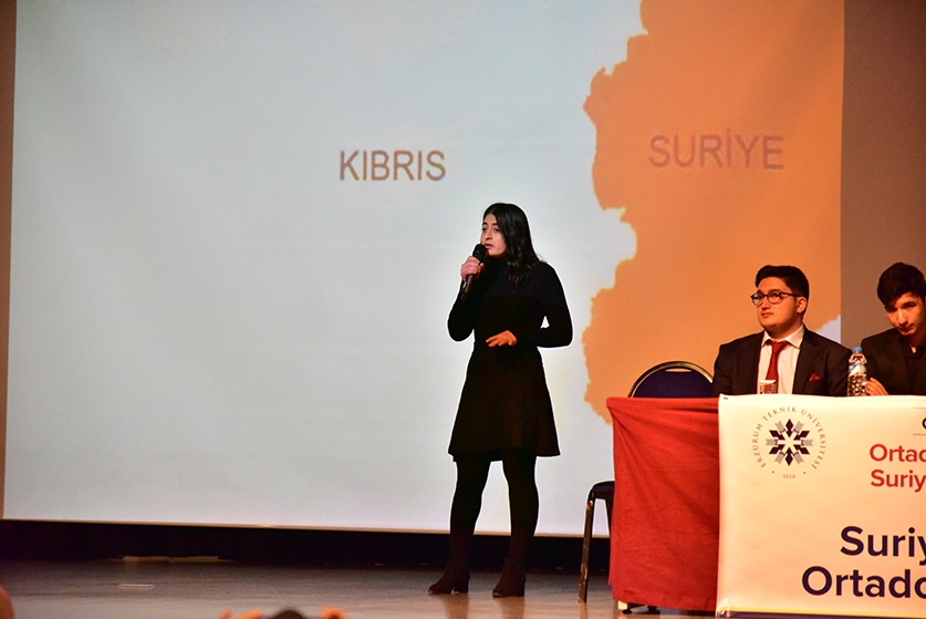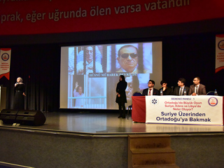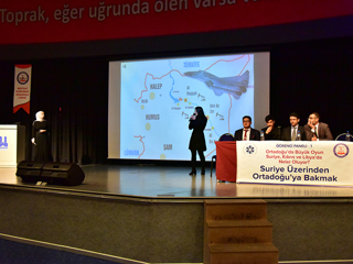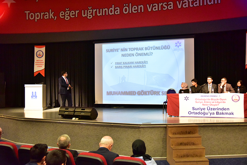 Panelde Nevzat Karabağ Anadolu Lisesi ile Erzurum Teknik Üniversitesi Edebiyat Fakültesi Tarih Bölümü öğrencileri sunumlarını yaptılar. İlk olarak Cengizhan ÖZDEMİR, Emirhan KAYA, Mısır, Libya, Rusya, Arap Birliği ve İsrail’in bölgedeki amaçları ve konumlarını değerlendirdiler. Ardından Hilal UZUN, Suriye’de 2011 yılında başlayan iç savaşa kadar bu ülkenin tarihinde nelerin yaşandığını anlattı. Umay KAYA ve Rabia KARAHAN ise 2011 yılında Suriye’de başlayan iç savaş sürecinde bu ülkede yaşanan insanlık dramı hakkında bilgi verdi. M. Göktürk SEVAL sunumunda, Türkiye açısından Suriye’nin toprak bütünlüğünün neden önemli olduğu sorusunun cevabını aramakla birlikte Fırat Kalkanı, Zeytin Dalı ve Barış Pınarı harekatlarının niçin yapıldığını ve ne anlam ifade ettiğini açıkladı. Leyla ÖZER, Suriye iç savaşıyla başlayan Suriyeli mülteciler meselesini birçok yönüyle değerlendirdi. Türkiye’nin yaptıklarını sayısal verilerle açıklayarak Avrupa’nın bu konuda üzerine düşen sorumluklarını yerine getirmediğini ifade etti.
