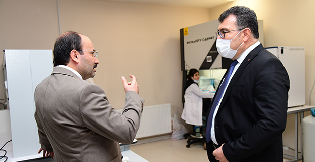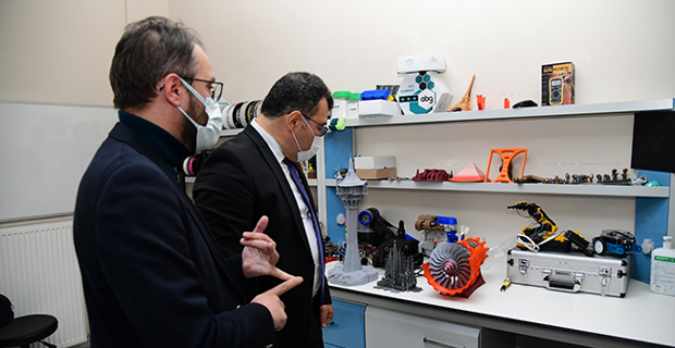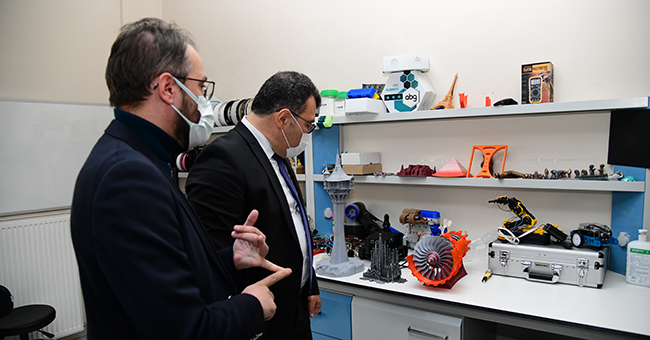Son olarak konuklarını kapasitesi yüksek Ar-Ge faaliyetleri yürütülen Yüksek Teknoloji Araştırma Merkezine götüren Rektör Çakmak, Fotonik ve Güneş Enerjisi Teknolojileri, Mikro/Nano Akışkanlar Mekaniği ve Isı Transferi, Biyomalzeme Üretimi ve Biyomekanikler ile Biyoteknoloji alanlarında yürütülen çalışmalar hakkında bilgi paylaşımında bulundu.