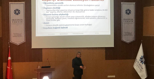 Çok sayıda öğrenci ve öğretim üyesinin katıldığı konferansta, Prof. Dr. Mustafa SÖZBİLİR, “Motivasyon nedir? Başarı ve motivasyon arasında nasıl bir ilişki vardır? Başarıyı olumsuz etkileyen faktörler nelerdir?” gibi konuları ele alarak katılımcıları bu konular hakkında bilgilendirdi. Aynı zamanda özgüven eksikliği, öğrenilmiş çaresizlik, mazeret bulma alışkanlığı vb. gibi konularda da bilgilerini öğrenci ve akademisyenlerle paylaşarak eğitimde ve yaşamın diğer alanlarında motivasyonun oldukça önemli olduğuna değindi.