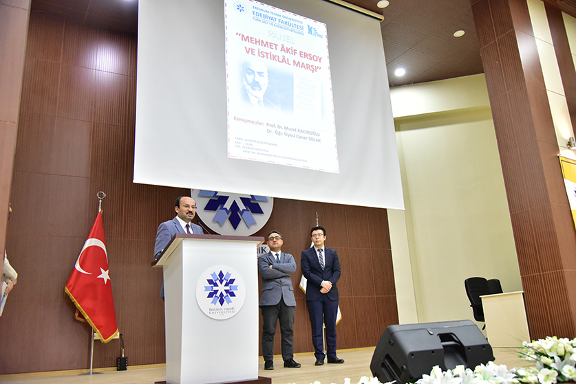 Türk Dili ve Edebiyatı Bölümü Öğretim Üyeleri Prof. Dr. Murat KACIROĞLU ve Dr. Öğr. Üyesi Caner SOLAK’ın konuşmacı oldukları panelde, Prof. Dr. Murat KACIROĞLU “Bir Kurucu Metin Olarak İstiklâl Marşı” başlıklı konuşmasını gerçekleştirdi. İstiklâl Marşı’nın Kurtuluş Savaşı'nın en hararetli günlerinde halkın birlik ve beraberlik içerisinde işgal güçlerine karşı direnç göstermesinde üstlendiği rolü ve şiirdeki “Korkma” ifadesinin İslam tarihine yönelik dini ve milli referanslarını anlattı. Dr. Öğr. Üyesi Caner SOLAK ise “Edebiyat Sosyolojisi Açısından Mehmet Akif Ersoy’un Asım Şiiri” başlıklı konuşmasında; Mehmet Akif ERSOY'un Asım şiirinde I. Dünya savaşına dair yer alan gözlemlerin tarihsel gerçeklikle olan uyumu üzerinde durdu.