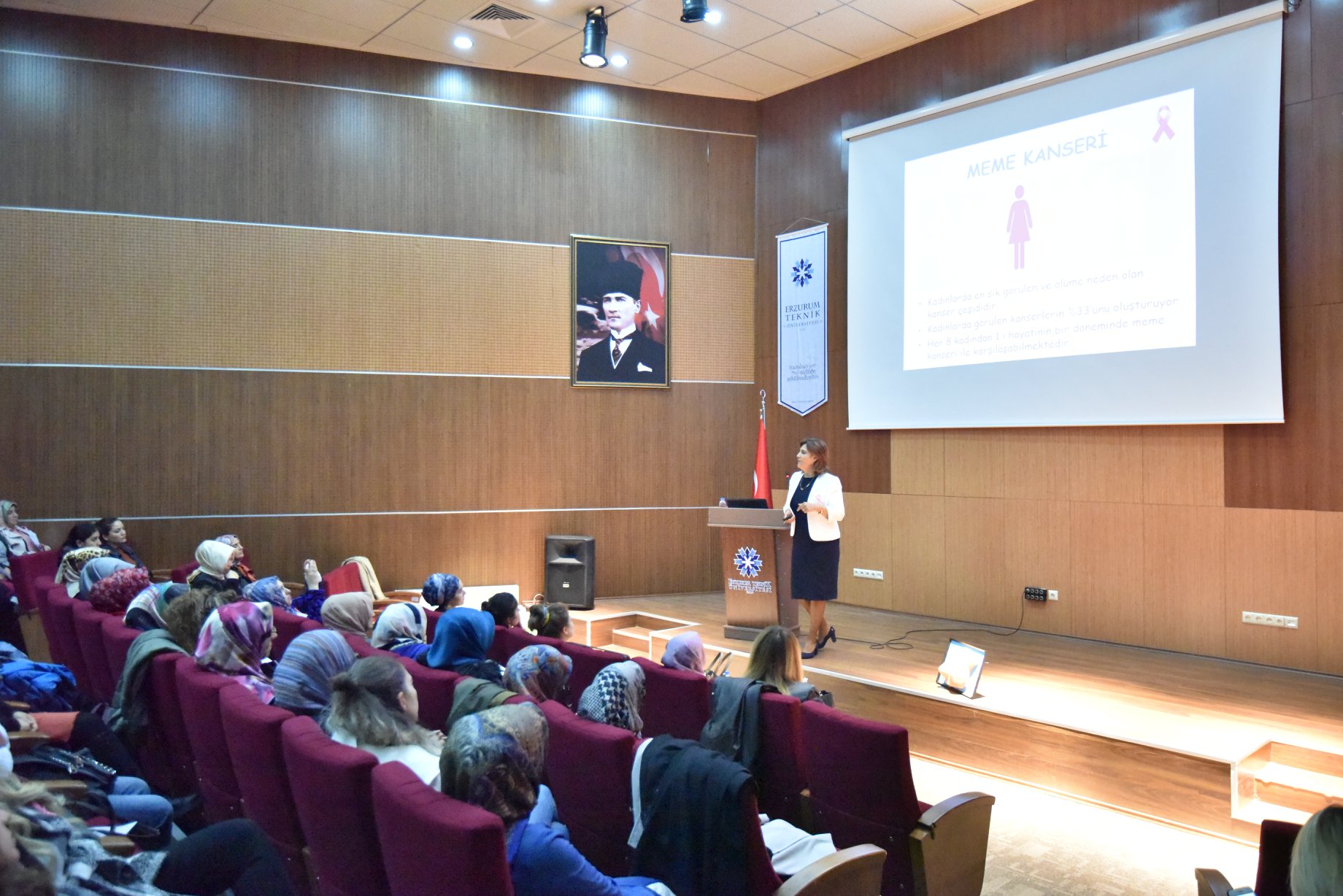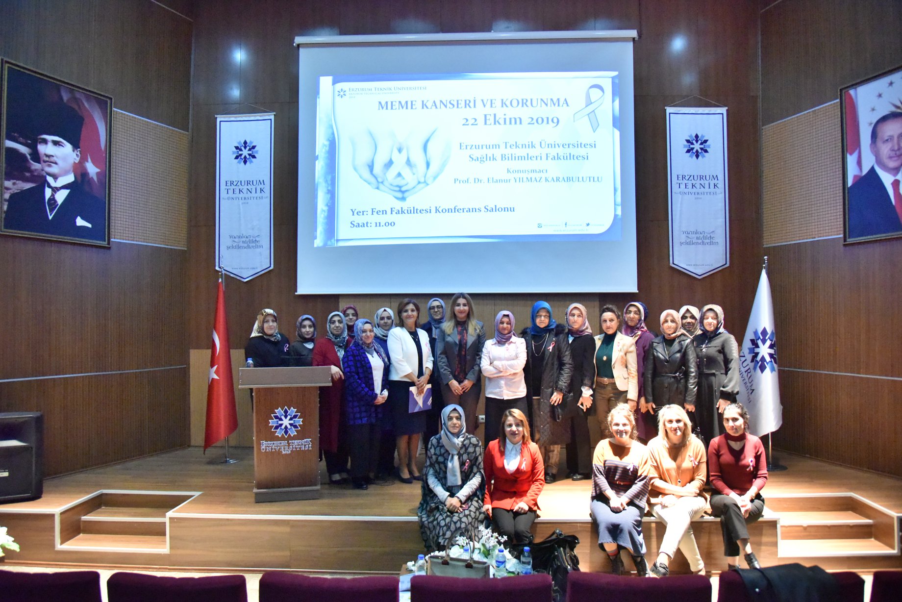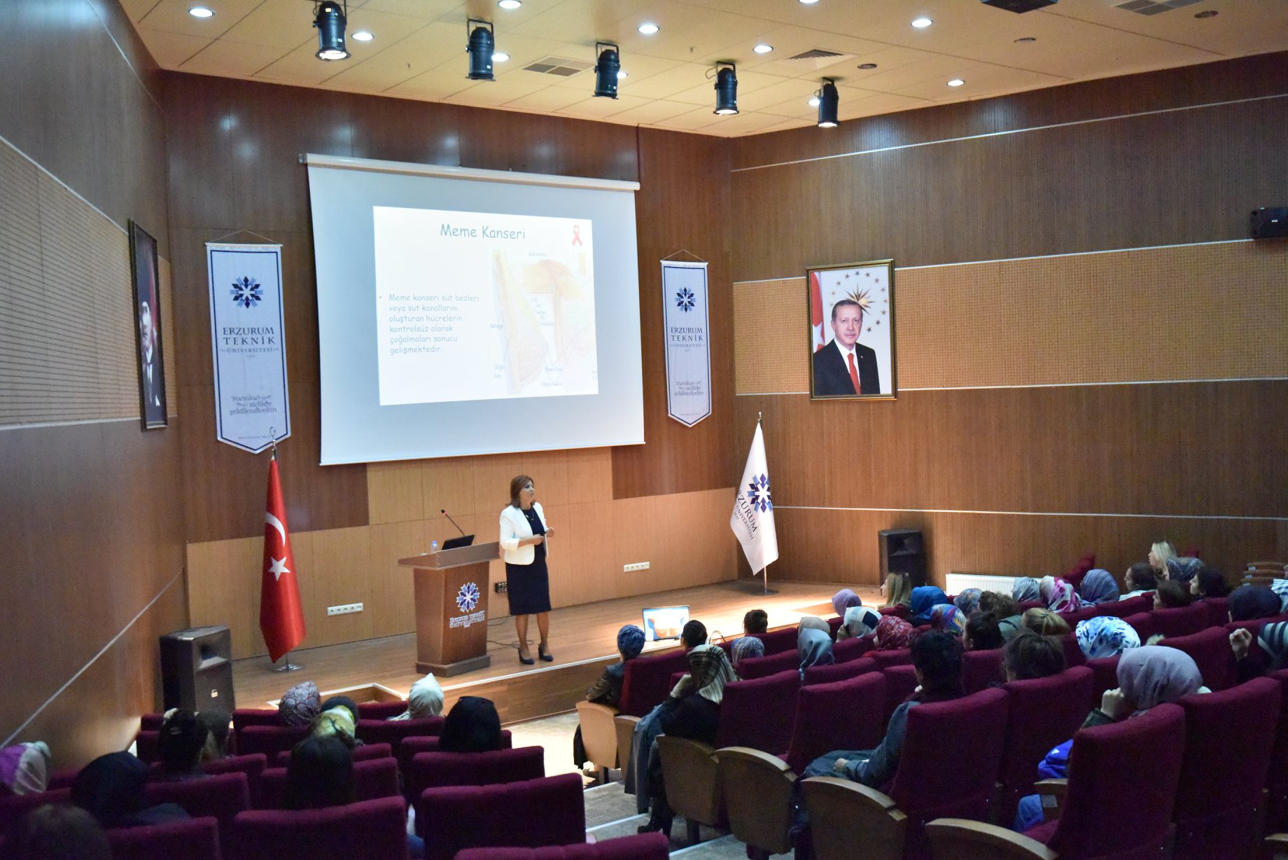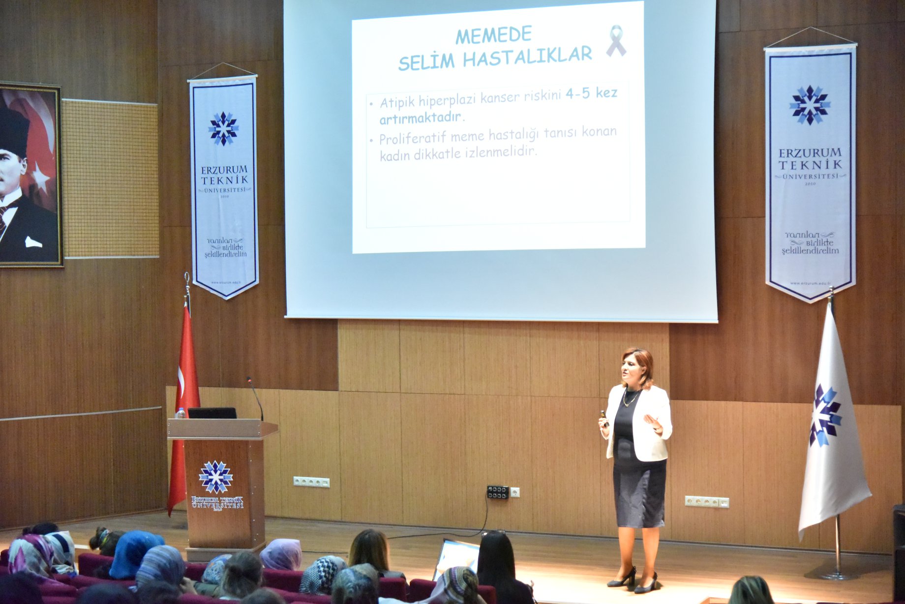 Toplumun bilinçlendirilmesi ve etkili bir farkındalık oluşması adına Erzurum Teknik Üniversitesi, “Meme Kanseri Farkındalık Ayı” kapsamında Fen Fakültesi Konferans salonunda “Meme Kanseri ve Korunma” adlı konferans gerçekleştirildi.