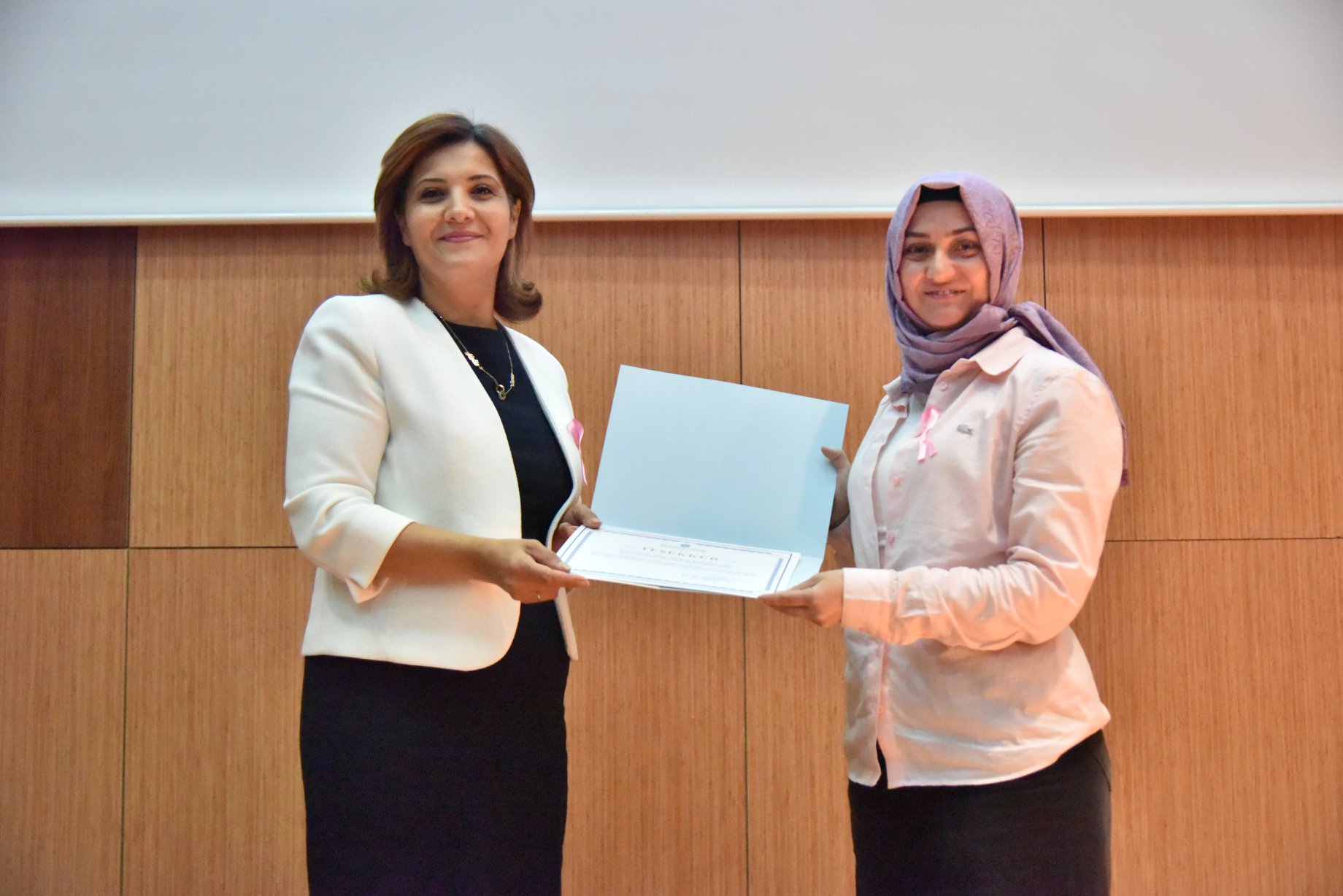 Konuşmalarına toplumun bilinçlendirilmesi ve etkili bir farkındalık oluşması adına Ekim ayının, “Meme Kanserini Bilinçlendirme Ayı” olarak kabul edildiğini söyleyerek devam eden Prof. Dr. Elanur Yılmaz Karabulutlu, pembe kurdelenin de meme kanserine dikkat çeken sembol olarak gösterildiğini söyledi.