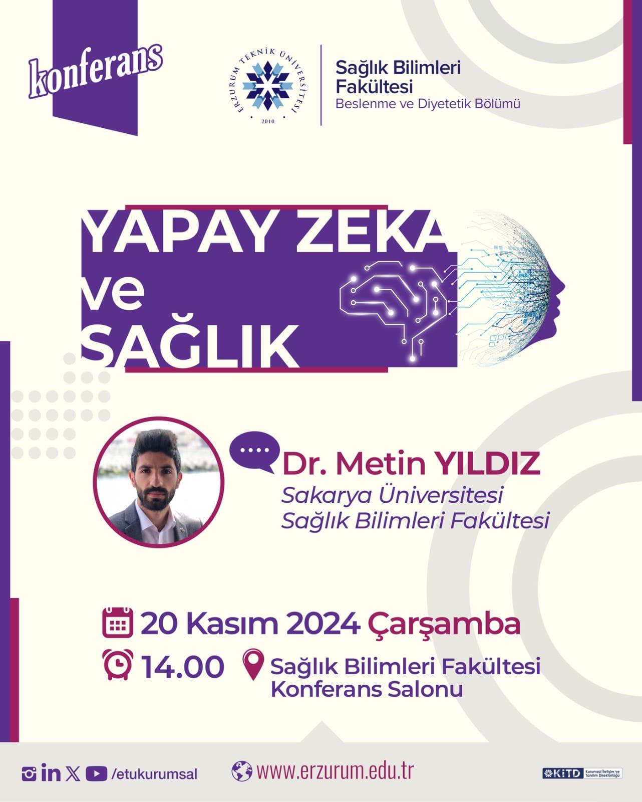 Yapay Zeka ve Sağlık isimli konferans 20 Kasım 2024 Çarşamba tarihinde Sağlık Bilimleri Fakültesi Konferans Salonunda gerçekleşecektir.