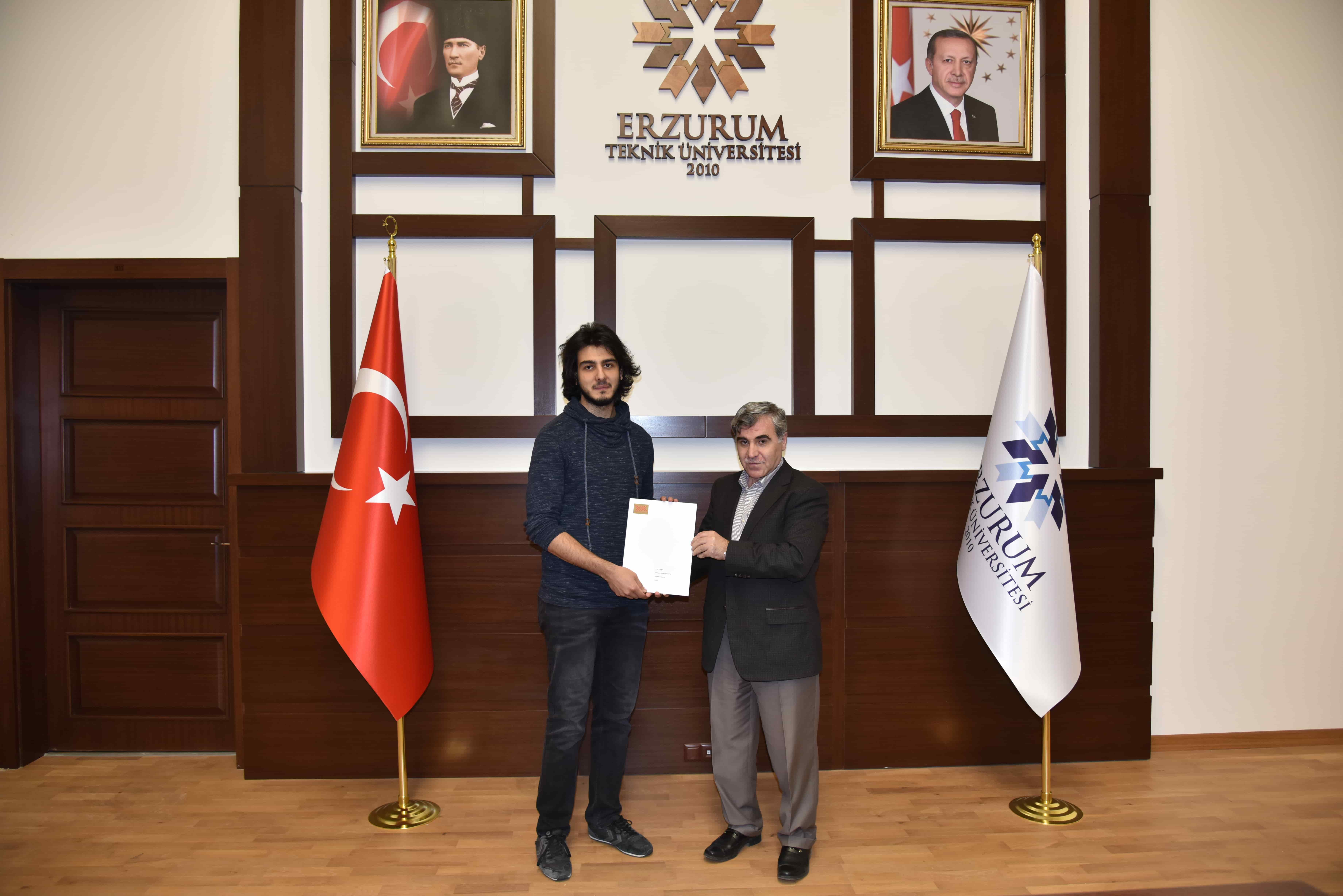 Prof. Dr. M. A. Yekta Saraç imzasıyla kaleme alınan tebrik metni, Fakültemiz Felsefe Bölümü öğrencisi Ahmet Yılmaz'a Dekanımız Prof. Dr. Selami Bakırcı tarafından verildi.