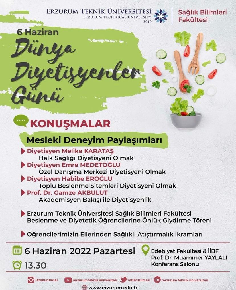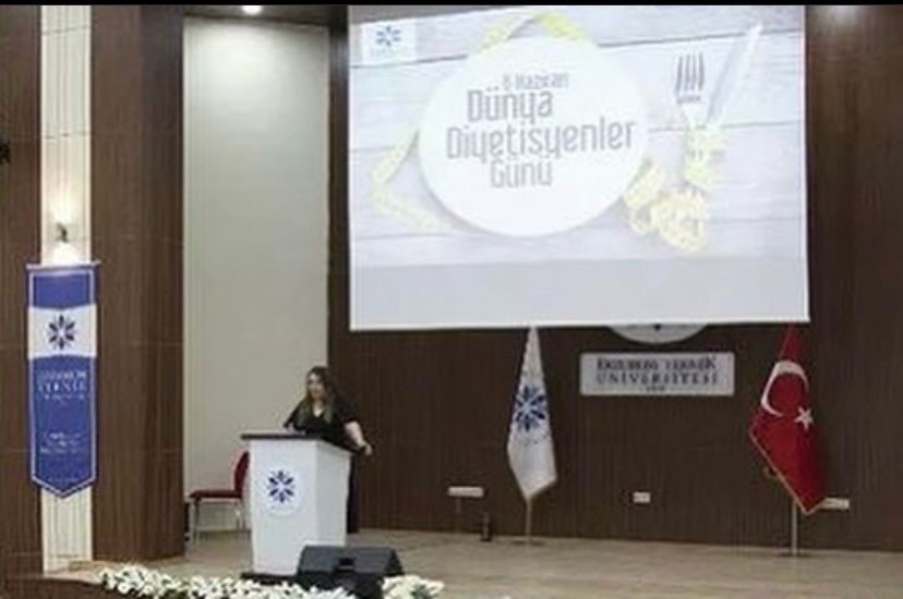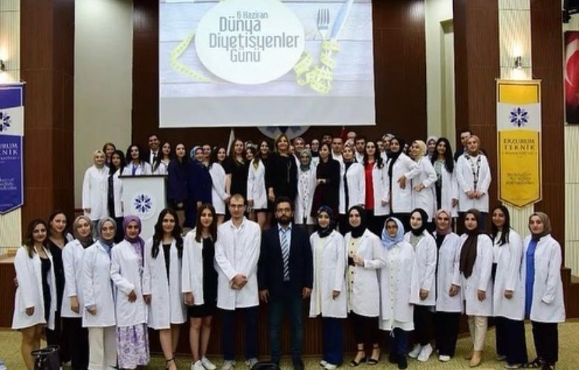 6 Haziran Dünya Diyetisyenler Günü Programında farklı alanlarda çalışan diyetisyenler konuşmacı olarak davet edilmiştir. Halk sağlığı alanında diyetisyenlik konusunda Dyt. Melike Karataş, özel danışma merkezinde diyetisyenlik konusunda Dyt. Emre Medetoğlu, toplu beslenme sistemleri alanında diyetisyenlik konusunda Dyt. Habibe Eroğlu, akademisyenlik konusunda da Prof. Dr. Gamze Akbulut kendi pencerelerinden diyetisyenlik mesleğini anlatmışlar, tecrübelerini paylaşmışlardır. Öğrencilerimizin sorularını yanıtlayarak kariyer planlamalarında yardımcı olmuşlardır. Programın son bölümünde 1.sınıf öğrencilerimiz için beyaz önlük giyme töreni yapılmıştır. Program bitiminde tüm konuklara öğrencilerimizin hazırlığı şekersiz hurmalı toplar, yulaflı kurabiye gibi sağlıklı atıştırmalıklar ikram edilmiştir.