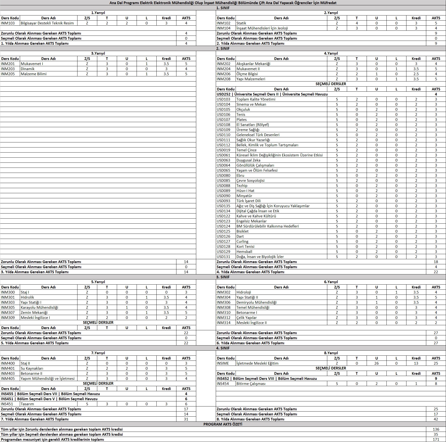 Ana Dal Programı Elektrik Elektronik Mühendisliği Olup İnşaat Mühendisliği Bölümünde Çift Ana Dal Yapacak Öğrenciler İçin Müfredat