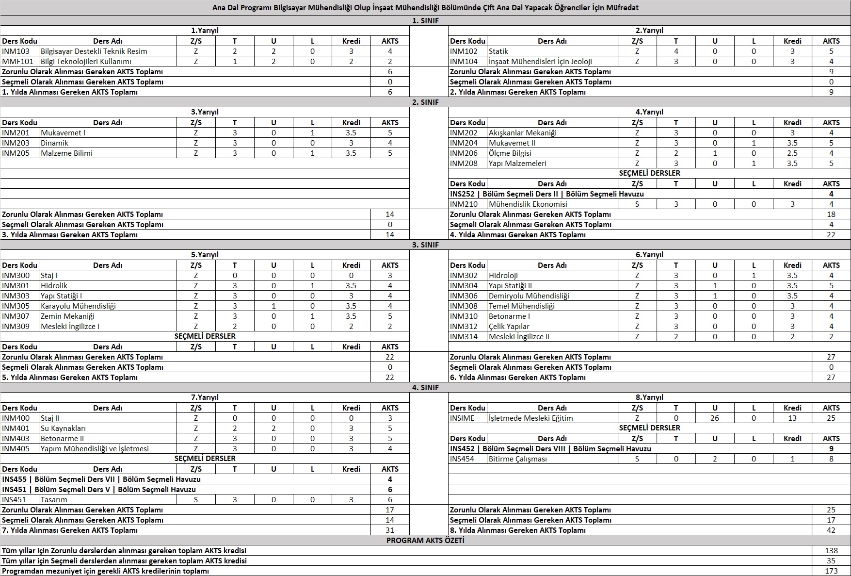 Ana Dal Programı Bilgisayar Mühendisliği Olup İnşaat Mühendisliği Bölümünde Çift Ana Dal Yapacak Öğrenciler İçin Müfredat