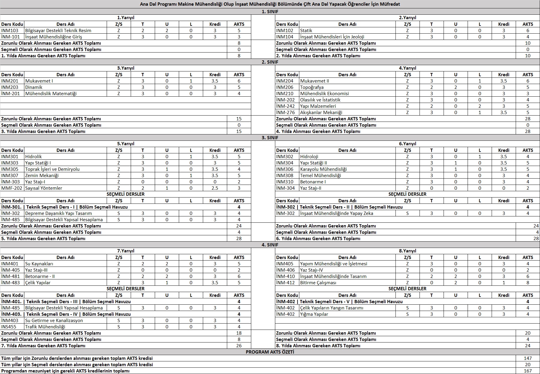 Ana Dal Programı Makine Mühendisliği Olup İnşaat Mühendisliği Bölümünde Çift Ana Dal Yapacak Öğrenciler İçin Müfredat (2024)